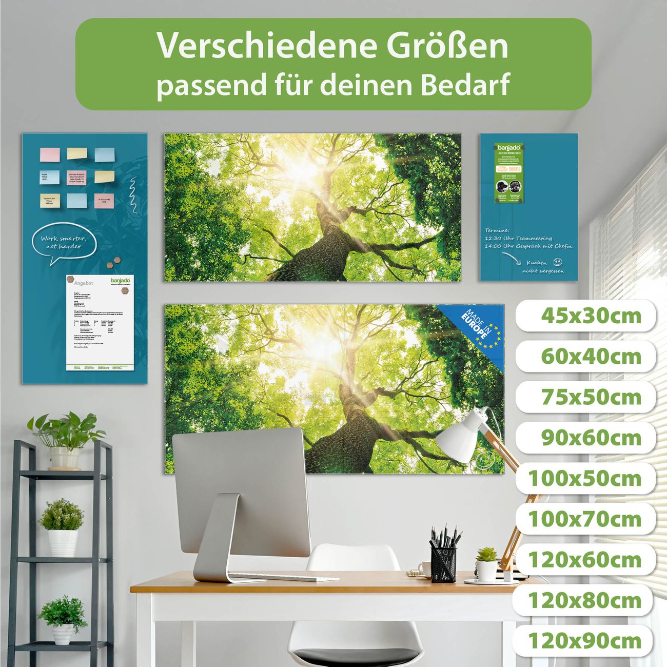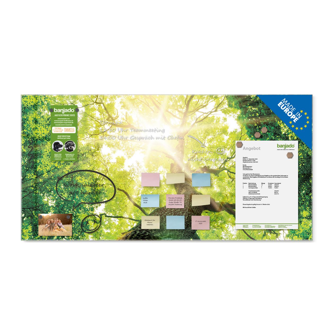 Jede Glas Magnettafel wird in unserer Werkstatt von Hand gefertigt und sorgfältig geprüft. So erhalten Sie ein echtes Qualitätsprodukt, das Funktion und Ästhetik perfekt vereint.?? Warum banjado?