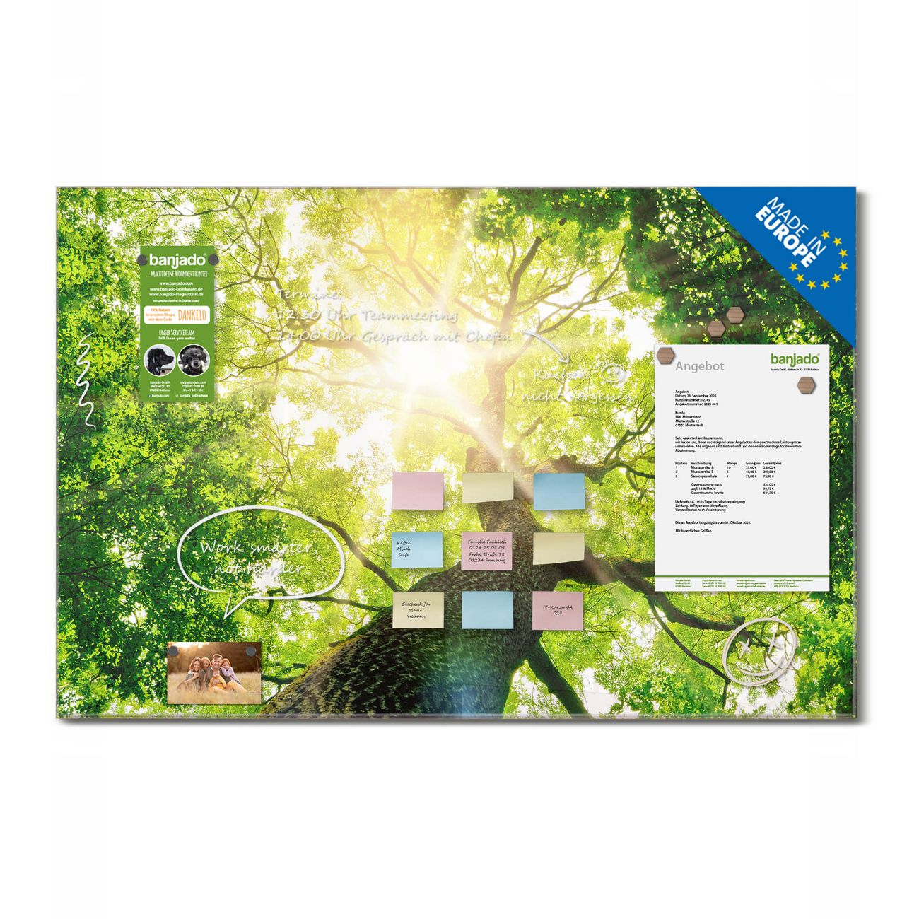 Jede Glas Magnettafel wird in unserer Werkstatt von Hand gefertigt und sorgfältig geprüft. So erhalten Sie ein echtes Qualitätsprodukt, das Funktion und Ästhetik perfekt vereint.?? Warum banjado?