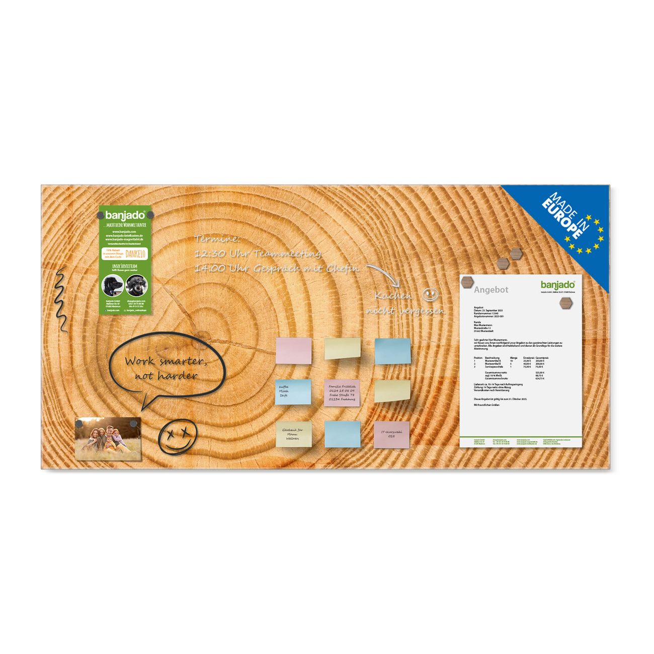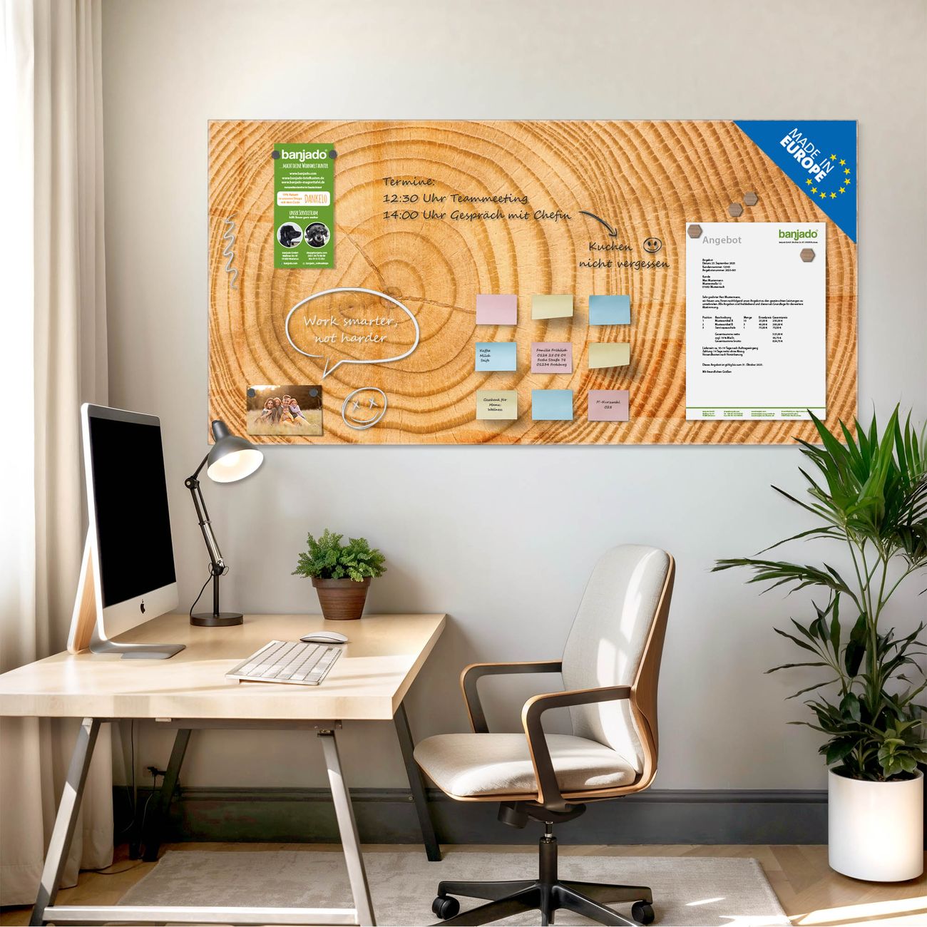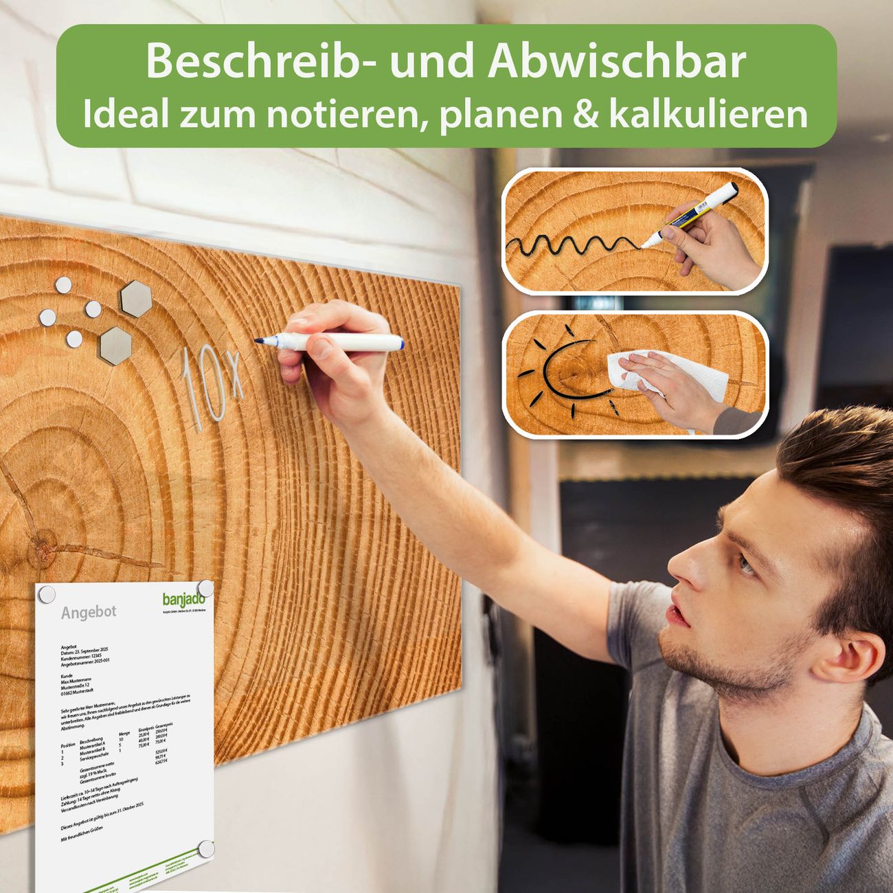Die banjado Glas Magnettafel mit dem Motiv Motiv Baumstamm verbindet Funktionalität mit Stil. Sie ersetzt das Zettelchaos durch klare Strukturen und bringt dabei eine warme, natürliche Atmosphäre in Ihr Zuhause. Ob im Büro, in der Küche oder im Eingangsbereich - dieses Design-Board zieht Blicke an und sorgt für Ordnung mit Charakter.