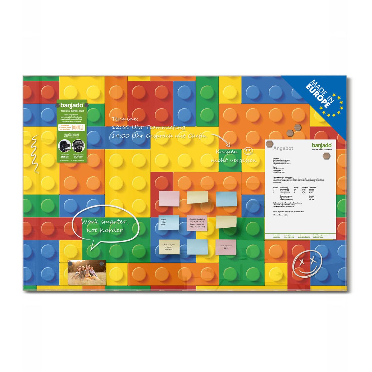 Ein Stück Design, das Ihren Alltag organisiert. Schreiben, heften, inspirieren - alles an einem Ort. Qualität, die man spürt. Montage leicht gemacht. Handwerk mit Herz - veredelt in Sachsen. Einzigartiges Design mit Motiv Motiv Bausteine Beschreibbare Glasoberfläche, leicht zu reinigen Starke Magnetkraft durch Stahlrückwand Inklusive 4 Neodym-Magneten Flexible Montageoptionen Handveredelt in Sachsen - Qualität, die bleibt