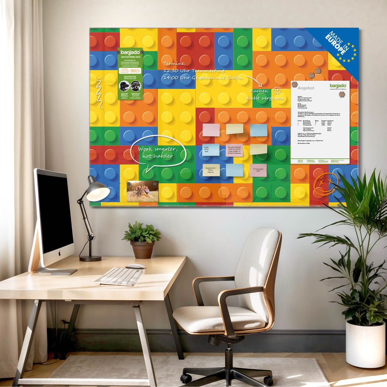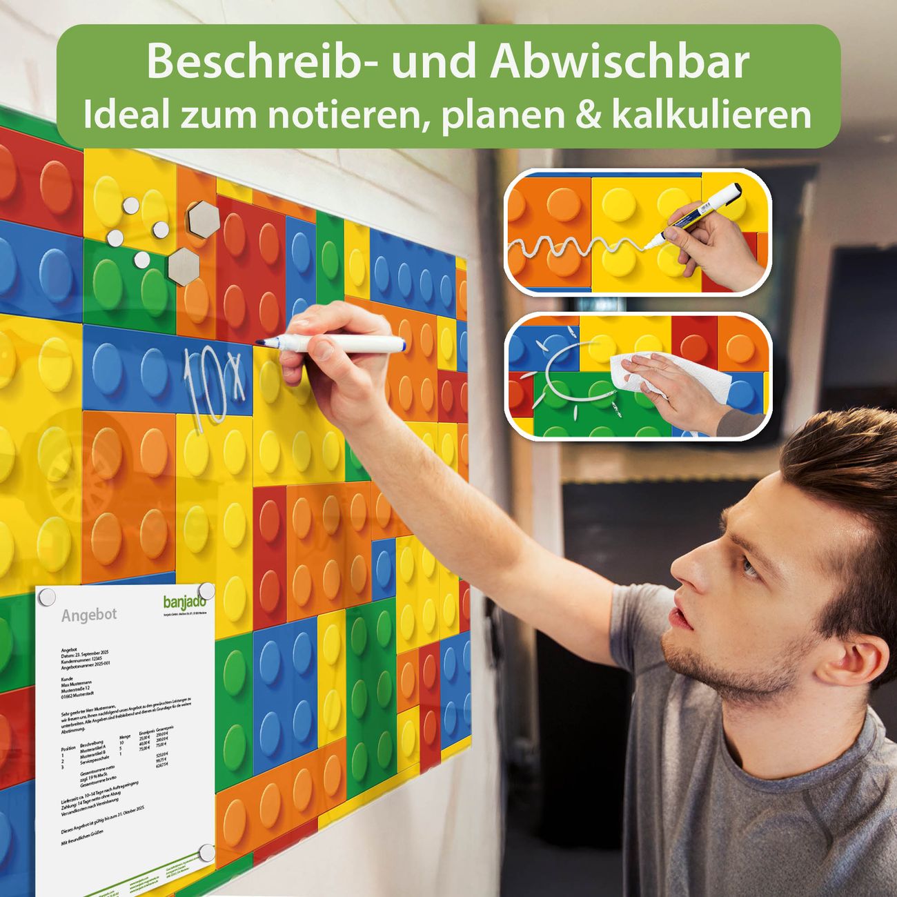 Jede Glas Magnettafel wird in unserer Werkstatt von Hand gefertigt und sorgfältig geprüft. So erhalten Sie ein echtes Qualitätsprodukt, das Funktion und Ästhetik perfekt vereint.?? Warum banjado?