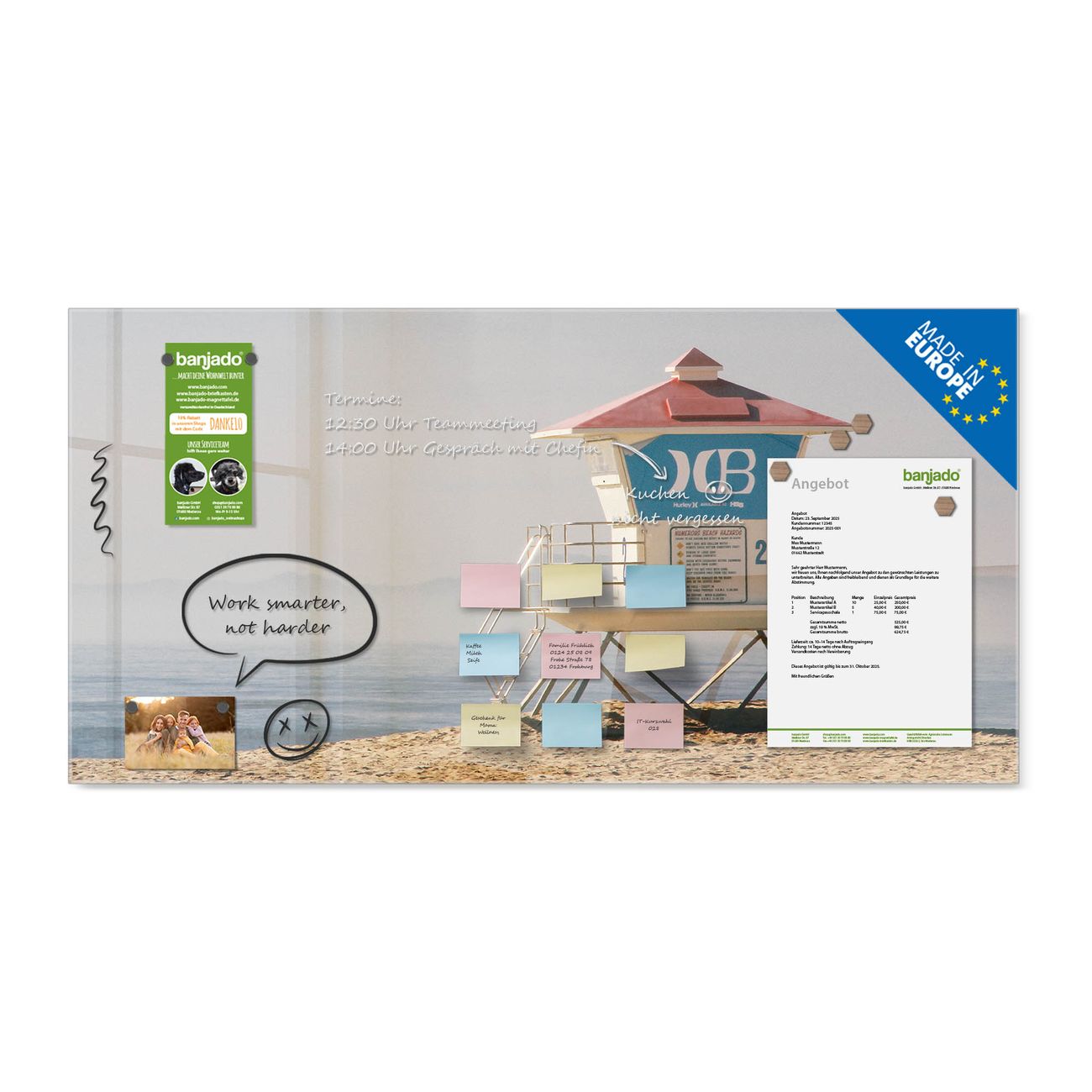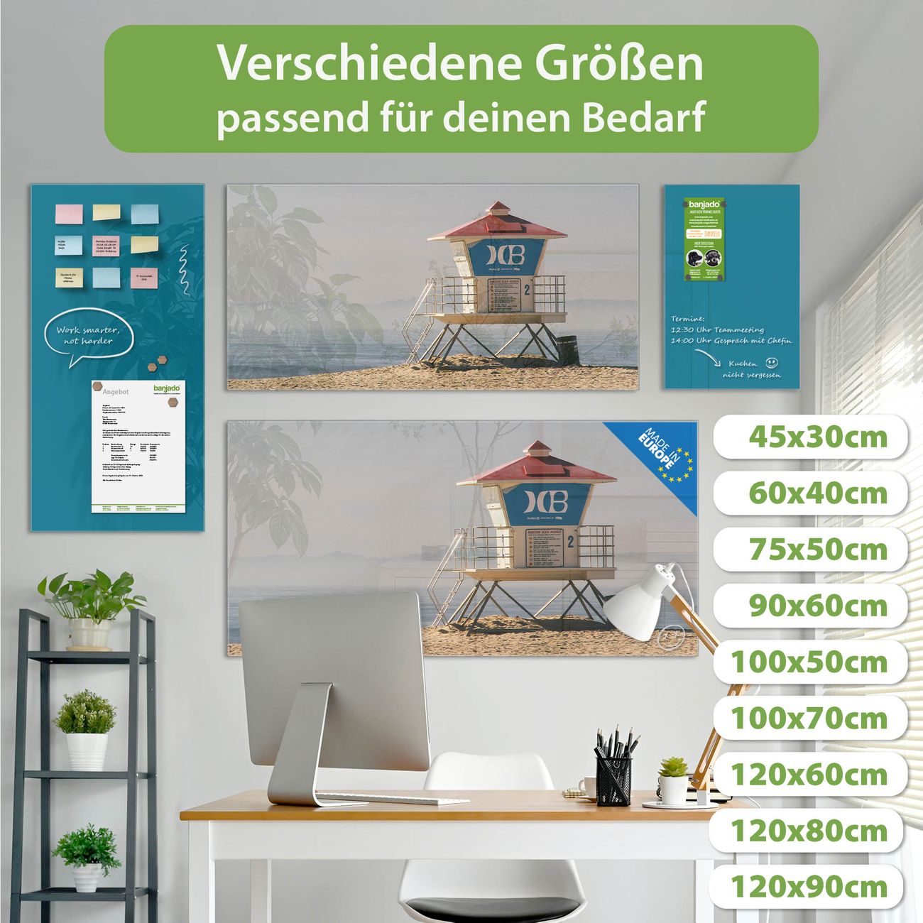 Jede Glas Magnettafel wird in unserer Werkstatt von Hand gefertigt und sorgfältig geprüft. So erhalten Sie ein echtes Qualitätsprodukt, das Funktion und Ästhetik perfekt vereint.?? Warum banjado?