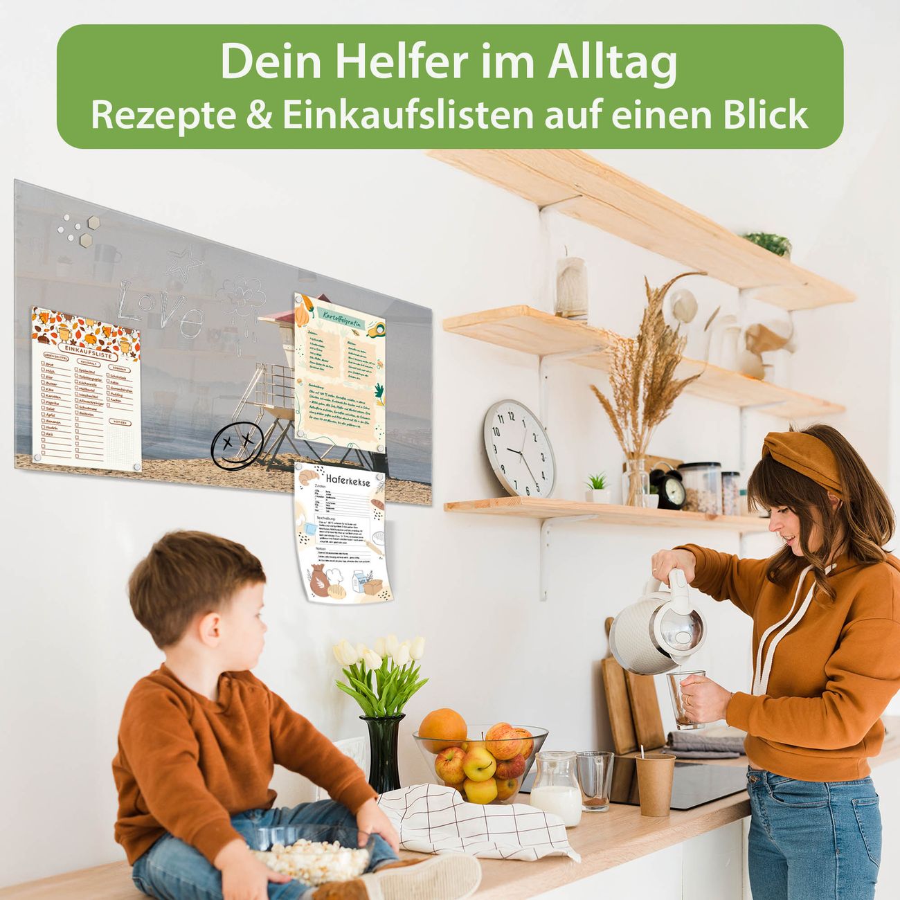 Auf der glatten Glasoberfläche lassen sich Termine, Rezepte oder Notizen ganz einfach mit Kreidestiften festhalten und rückstandslos entfernen. Starke Neodym-Magnete halten Ihre wichtigsten Erinnerungen sicher an Ort und Stelle. So entsteht Ihre ganz persönliche Ideenwand - jeden Tag neu.