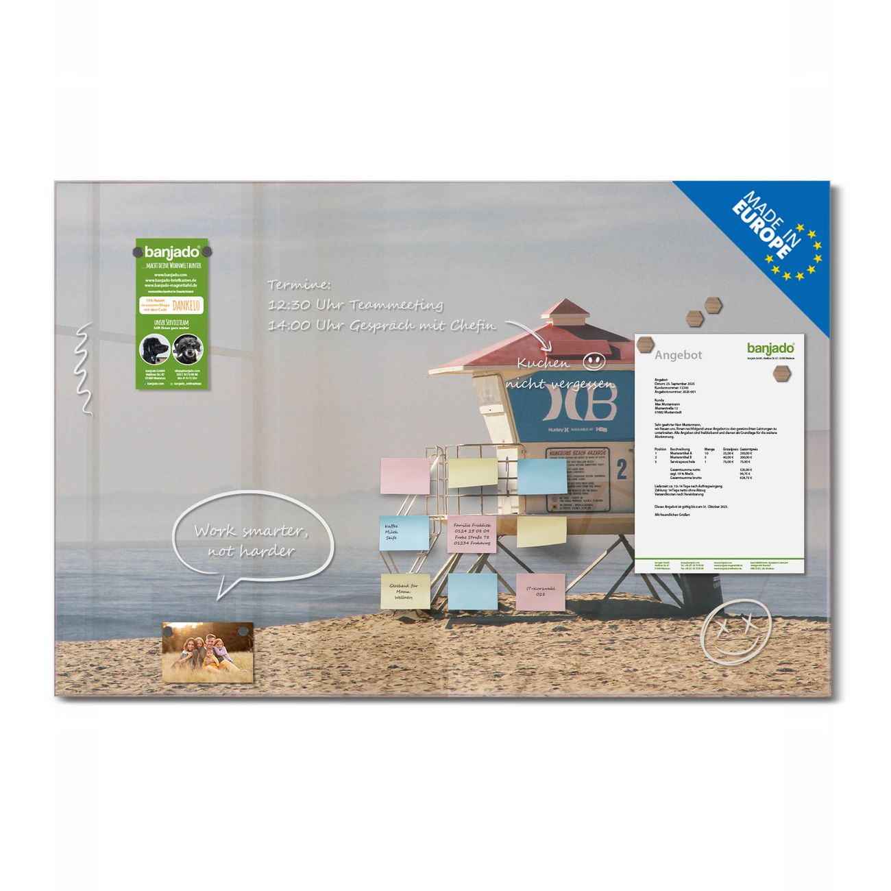 Jede Glas Magnettafel wird in unserer Werkstatt von Hand gefertigt und sorgfältig geprüft. So erhalten Sie ein echtes Qualitätsprodukt, das Funktion und Ästhetik perfekt vereint.?? Warum banjado?
