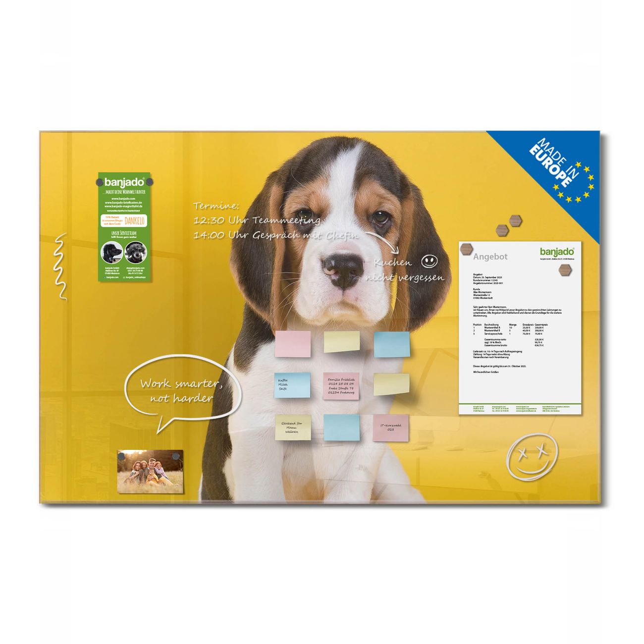 Die banjado Glas Magnettafel mit dem Motiv Motiv Beagle verbindet Funktionalität mit Stil. Sie ersetzt das Zettelchaos durch klare Strukturen und bringt dabei eine warme, natürliche Atmosphäre in Ihr Zuhause. Ob im Büro, in der Küche oder im Eingangsbereich - dieses Design-Board zieht Blicke an und sorgt für Ordnung mit Charakter.