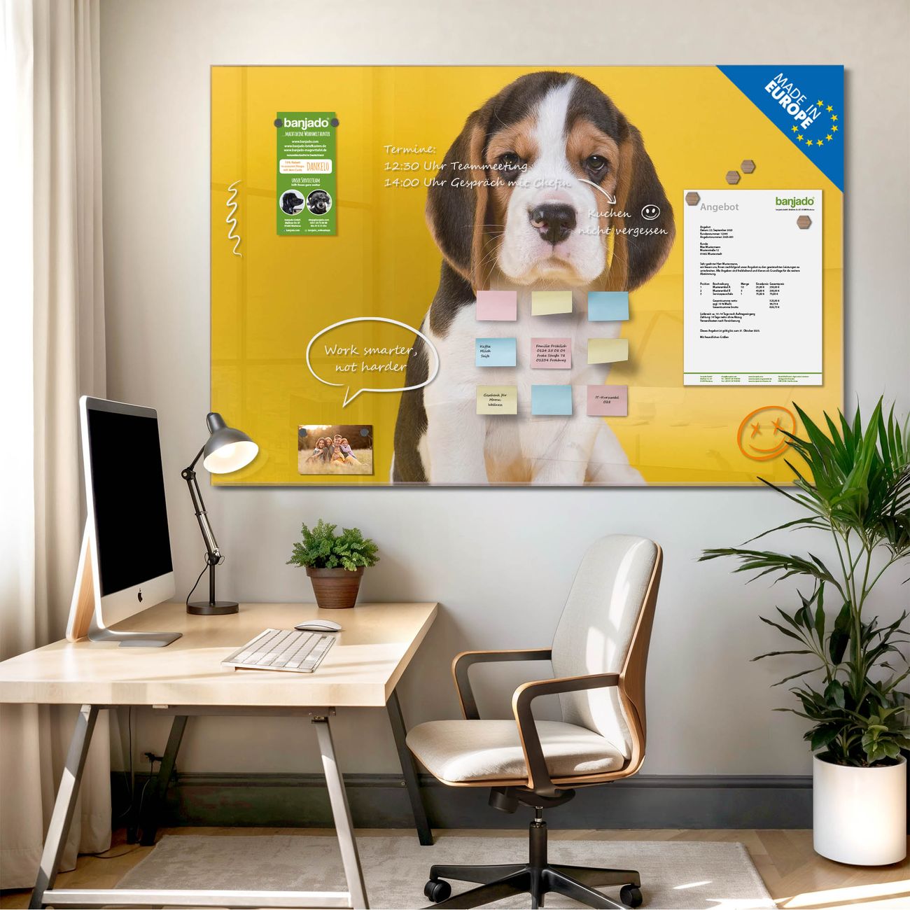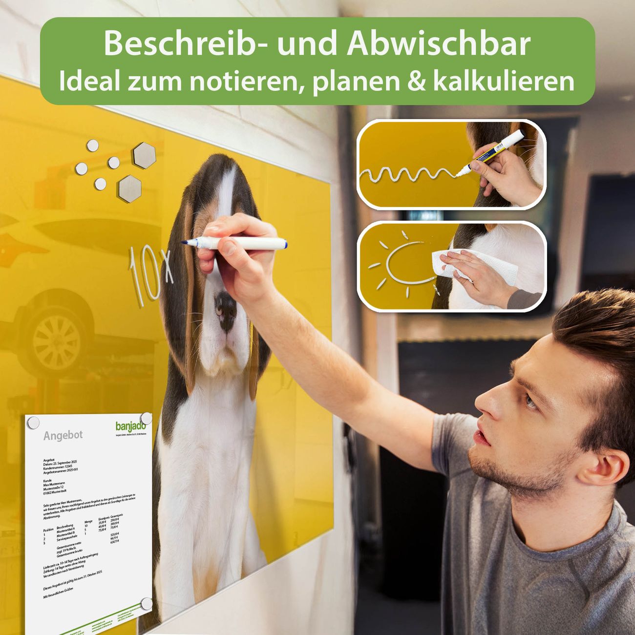 Jede Glas Magnettafel wird in unserer Werkstatt von Hand gefertigt und sorgfältig geprüft. So erhalten Sie ein echtes Qualitätsprodukt, das Funktion und Ästhetik perfekt vereint.?? Warum banjado?