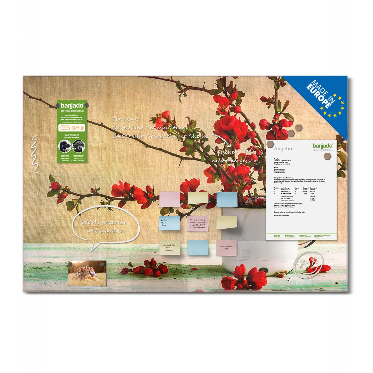 Jede Glas Magnettafel wird in unserer Werkstatt von Hand gefertigt und sorgfältig geprüft. So erhalten Sie ein echtes Qualitätsprodukt, das Funktion und Ästhetik perfekt vereint.?? Warum banjado?