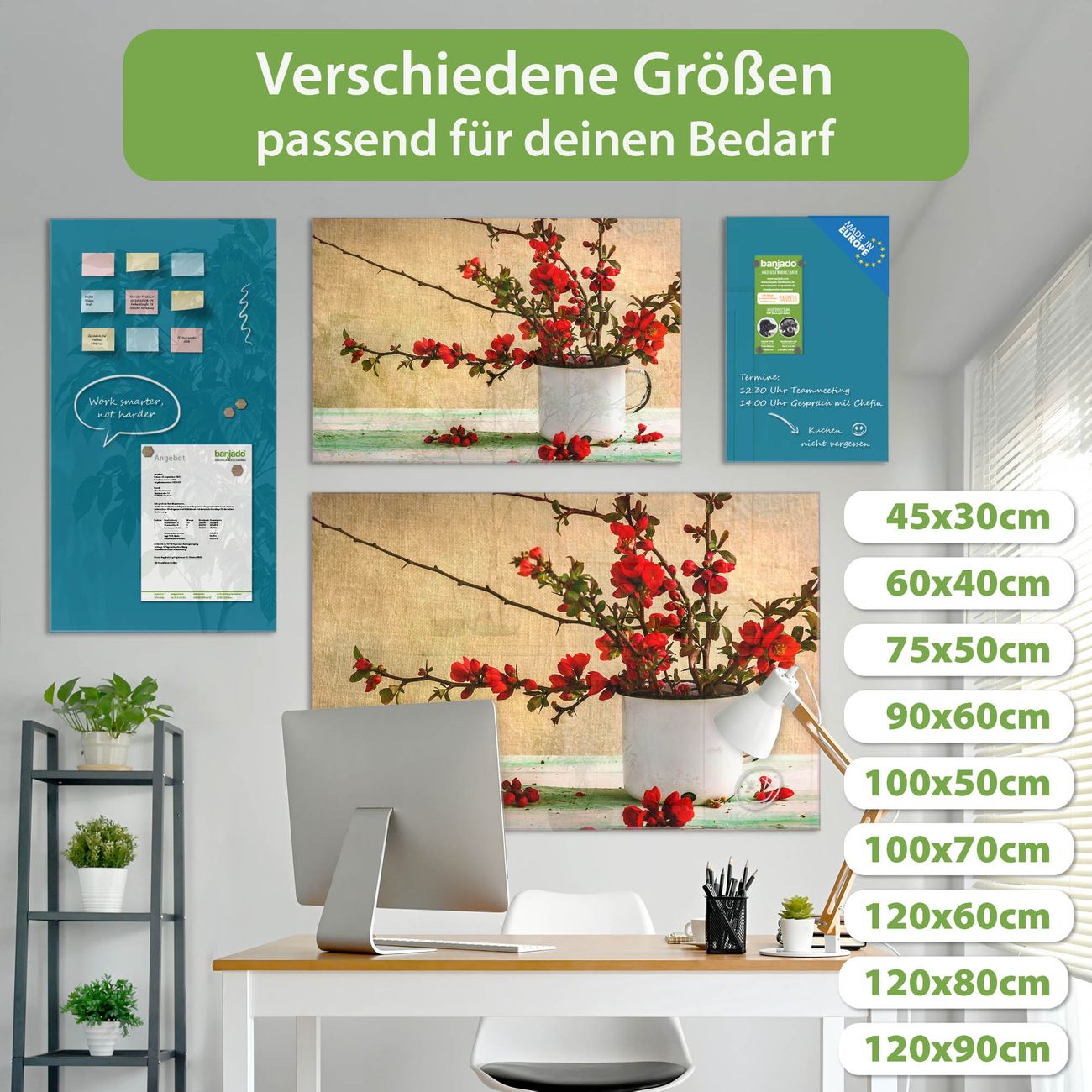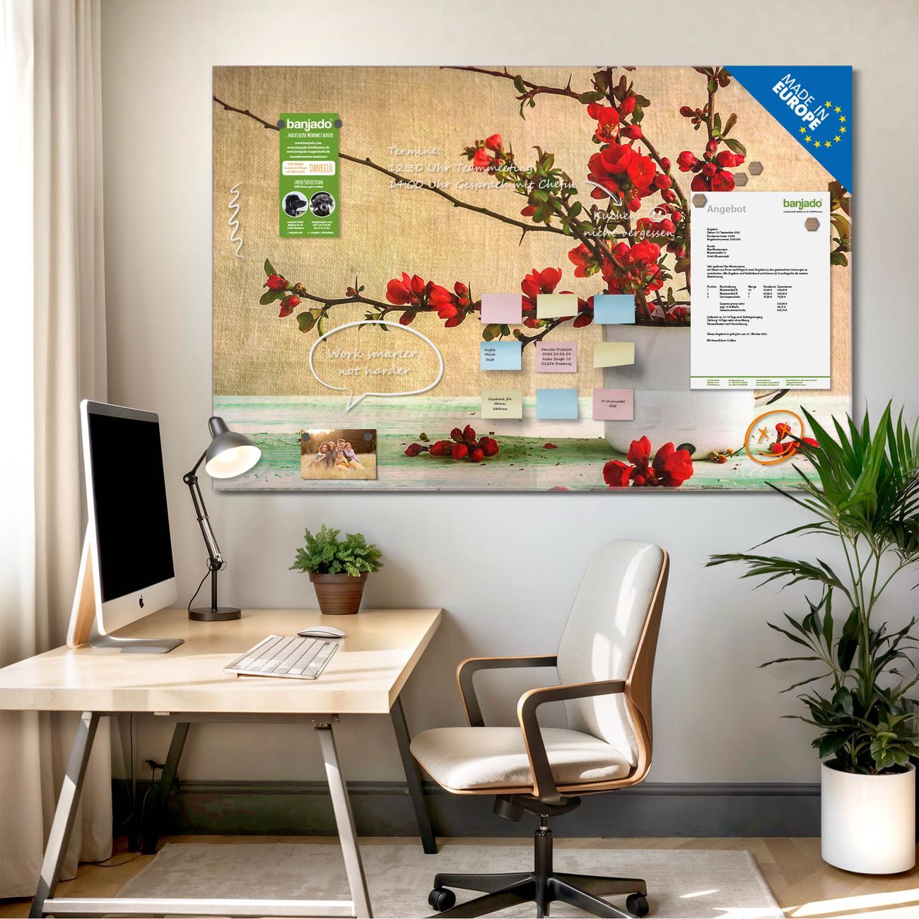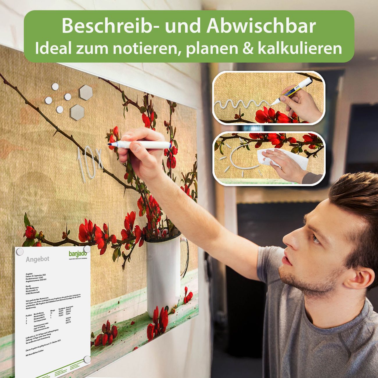 Jede Glas Magnettafel wird in unserer Werkstatt von Hand gefertigt und sorgfältig geprüft. So erhalten Sie ein echtes Qualitätsprodukt, das Funktion und Ästhetik perfekt vereint.?? Warum banjado?