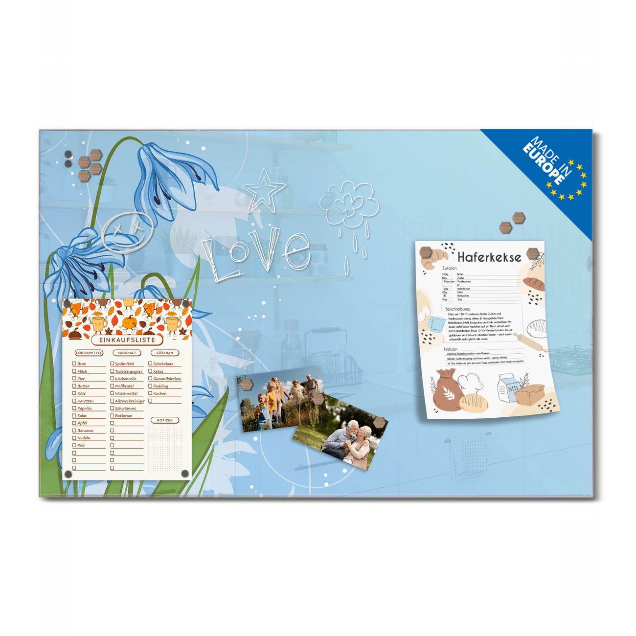 Ein Stück Design, das Ihren Alltag organisiert. Schreiben, heften, inspirieren - alles an einem Ort. Qualität, die man spürt. Montage leicht gemacht. Handwerk mit Herz - veredelt in Sachsen. Einzigartiges Design mit Motiv Motiv Bergblaulilie Beschreibbare Glasoberfläche, leicht zu reinigen Starke Magnetkraft durch Stahlrückwand Inklusive 4 Neodym-Magneten Flexible Montageoptionen Handveredelt in Sachsen - Qualität, die bleibt