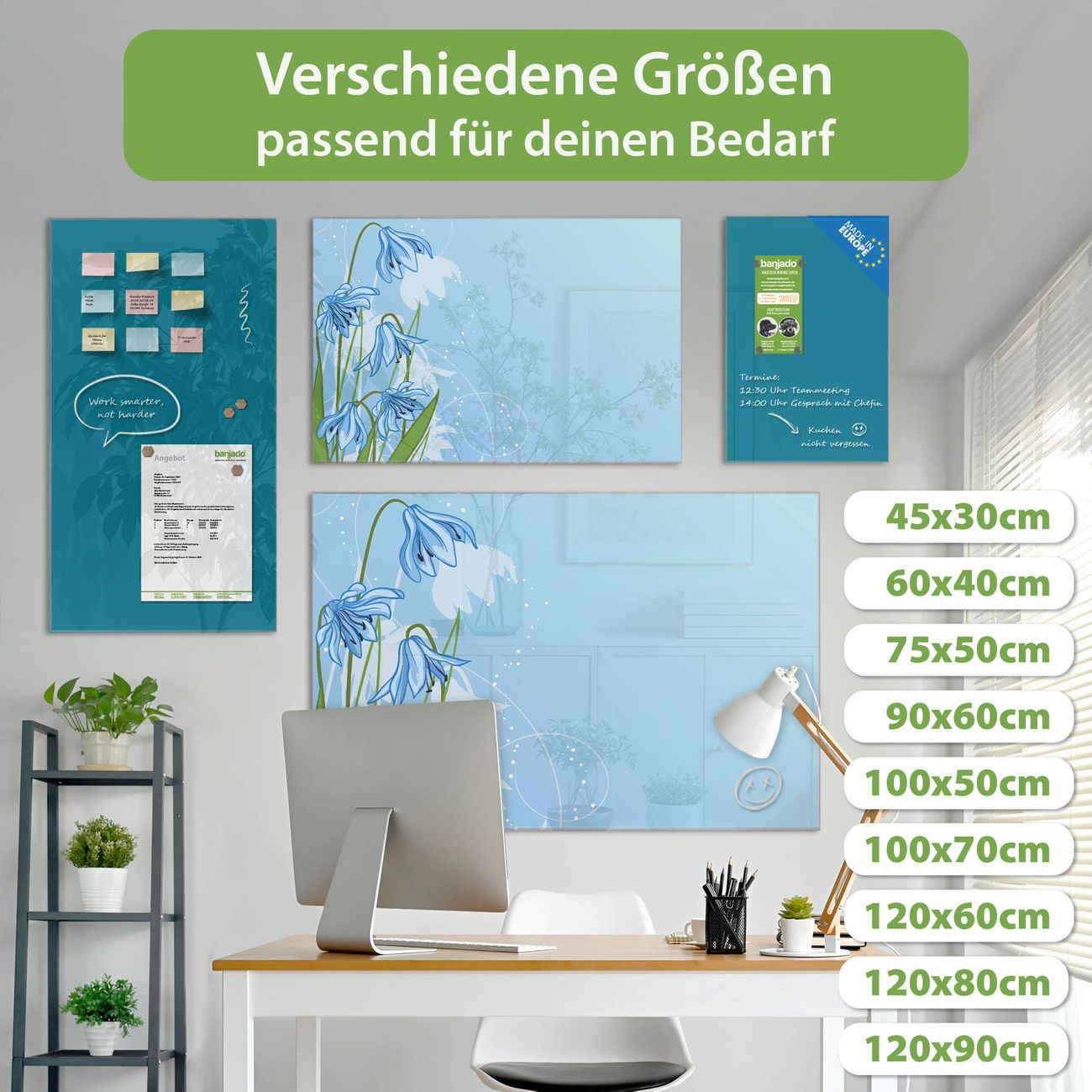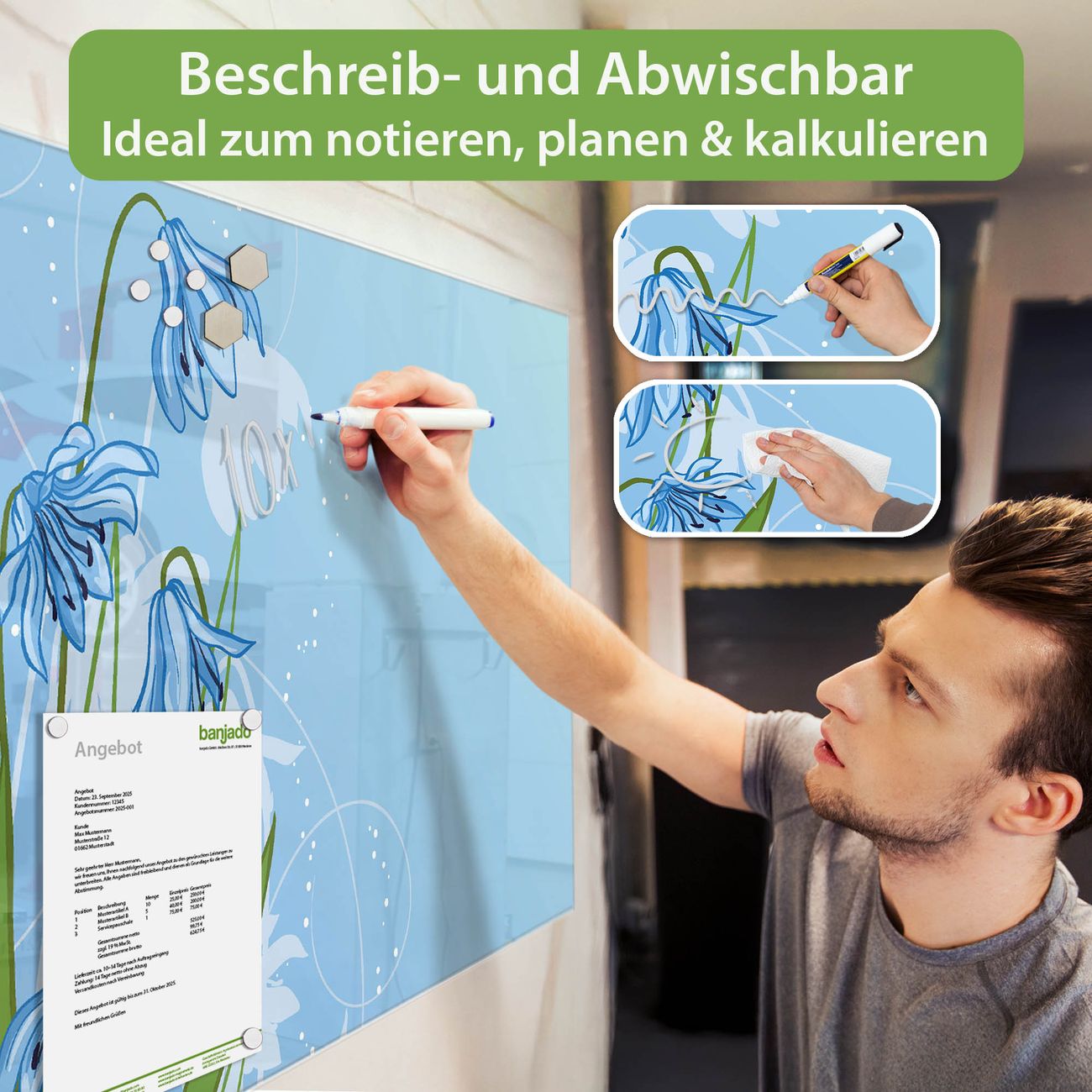 Jede Glas Magnettafel wird in unserer Werkstatt von Hand gefertigt und sorgfältig geprüft. So erhalten Sie ein echtes Qualitätsprodukt, das Funktion und Ästhetik perfekt vereint.?? Warum banjado?