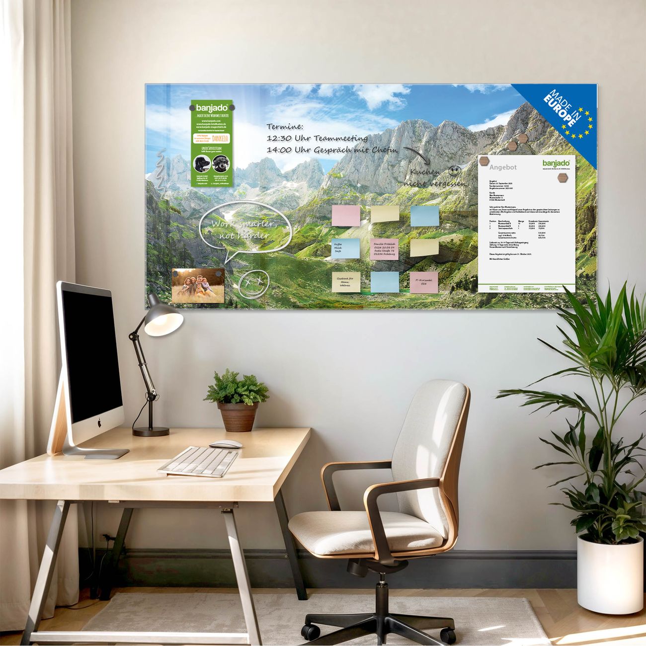 Jede Glas Magnettafel wird in unserer Werkstatt von Hand gefertigt und sorgfältig geprüft. So erhalten Sie ein echtes Qualitätsprodukt, das Funktion und Ästhetik perfekt vereint.?? Warum banjado?