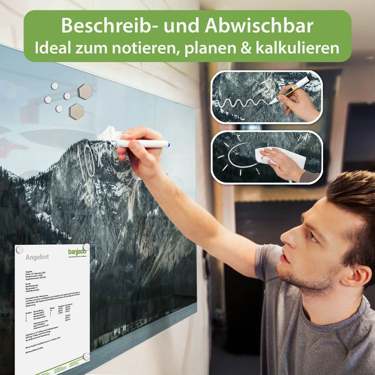 Jede Glas Magnettafel wird in unserer Werkstatt von Hand gefertigt und sorgfältig geprüft. So erhalten Sie ein echtes Qualitätsprodukt, das Funktion und Ästhetik perfekt vereint.?? Warum banjado?
