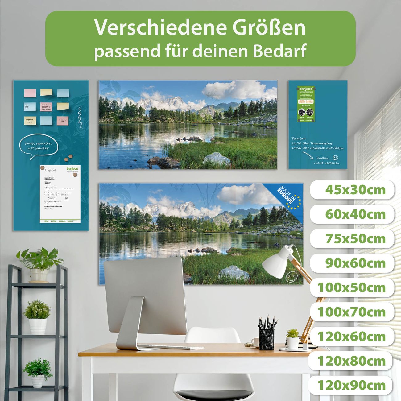 Die banjado Glas Magnettafel mit dem Motiv Motiv Gebirgssee verbindet Funktionalität mit Stil. Sie ersetzt das Zettelchaos durch klare Strukturen und bringt dabei eine warme, natürliche Atmosphäre in Ihr Zuhause. Ob im Büro, in der Küche oder im Eingangsbereich - dieses Design-Board zieht Blicke an und sorgt für Ordnung mit Charakter.