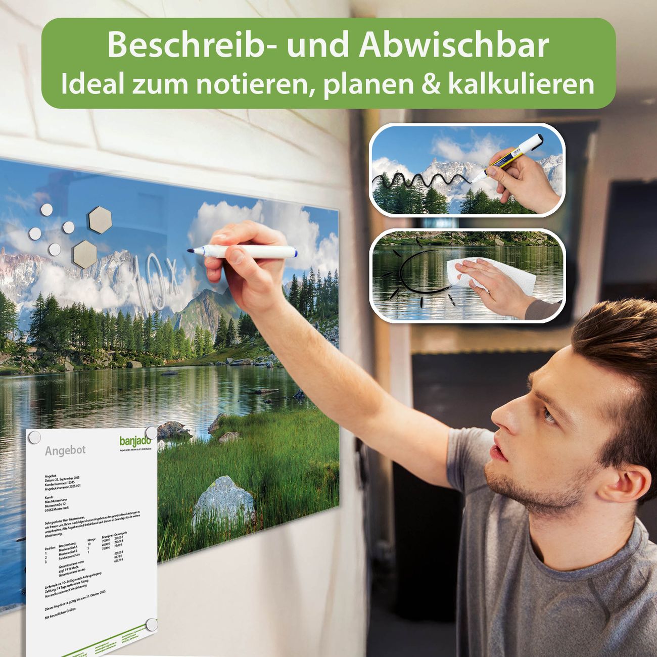 Jede Glas Magnettafel wird in unserer Werkstatt von Hand gefertigt und sorgfältig geprüft. So erhalten Sie ein echtes Qualitätsprodukt, das Funktion und Ästhetik perfekt vereint.?? Warum banjado?