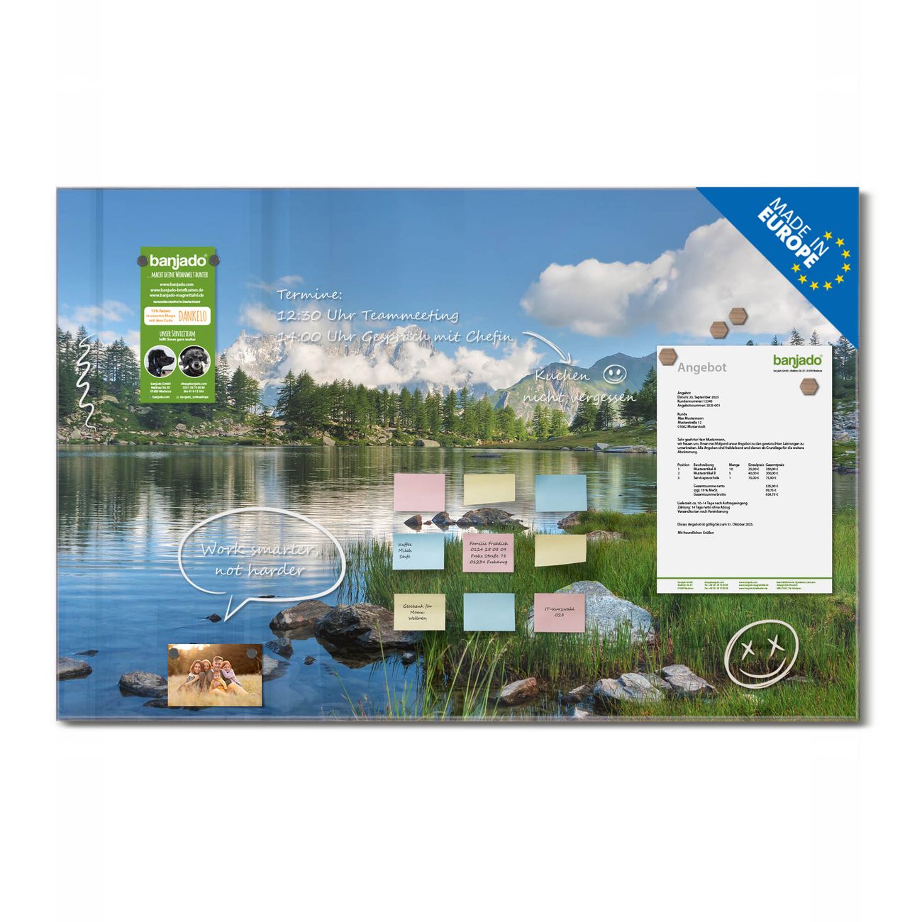Jede Glas Magnettafel wird in unserer Werkstatt von Hand gefertigt und sorgfältig geprüft. So erhalten Sie ein echtes Qualitätsprodukt, das Funktion und Ästhetik perfekt vereint.?? Warum banjado?
