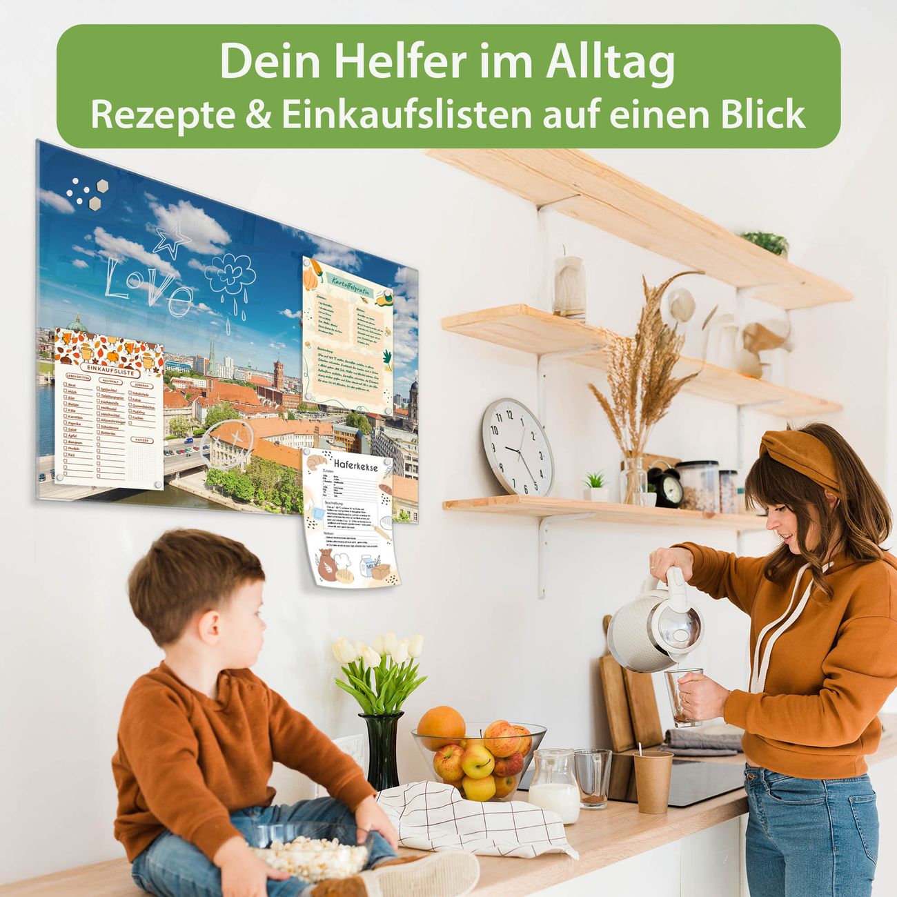 Ein Stück Design, das Ihren Alltag organisiert. Schreiben, heften, inspirieren - alles an einem Ort. Qualität, die man spürt. Montage leicht gemacht. Handwerk mit Herz - veredelt in Sachsen. Einzigartiges Design mit Motiv Motiv Berlin Mitte Beschreibbare Glasoberfläche, leicht zu reinigen Starke Magnetkraft durch Stahlrückwand Inklusive 4 Neodym-Magneten Flexible Montageoptionen Handveredelt in Sachsen - Qualität, die bleibt