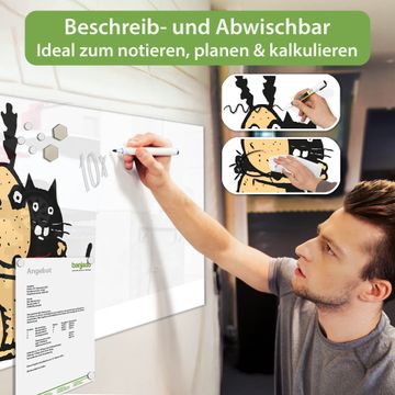Auf der glatten Glasoberfläche lassen sich Termine, Rezepte oder Notizen ganz einfach mit Kreidestiften festhalten und rückstandslos entfernen. Starke Neodym-Magnete halten Ihre wichtigsten Erinnerungen sicher an Ort und Stelle. So entsteht Ihre ganz persönliche Ideenwand - jeden Tag neu.