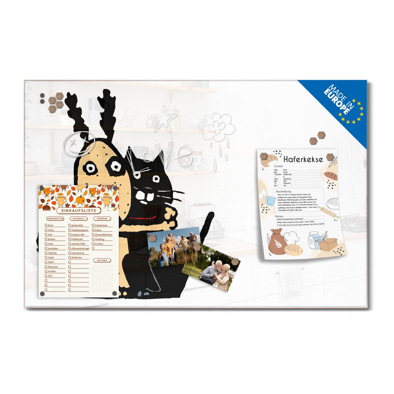 Ein Stück Design, das Ihren Alltag organisiert. Schreiben, heften, inspirieren - alles an einem Ort. Qualität, die man spürt. Montage leicht gemacht. Handwerk mit Herz - veredelt in Sachsen. Einzigartiges Design mit Motiv Motiv Beste Freunde Immer Beschreibbare Glasoberfläche, leicht zu reinigen Starke Magnetkraft durch Stahlrückwand Inklusive 4 Neodym-Magneten Flexible Montageoptionen Handveredelt in Sachsen - Qualität, die bleibt