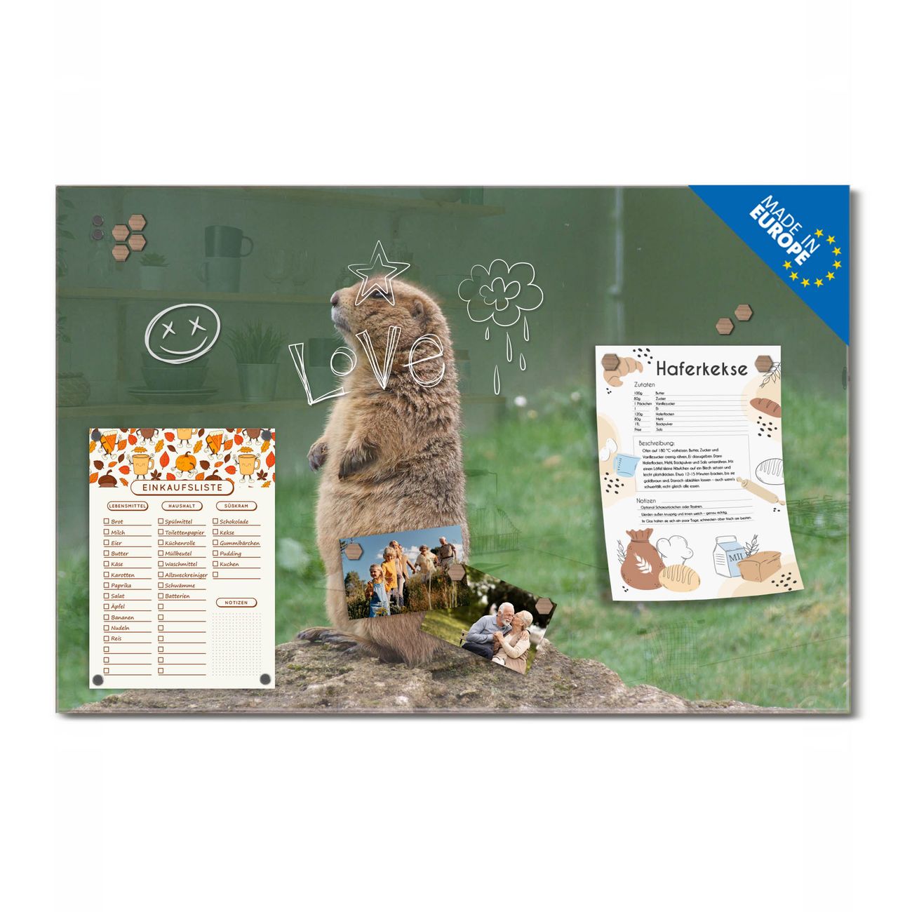 Ein Stück Design, das Ihren Alltag organisiert. Schreiben, heften, inspirieren - alles an einem Ort. Qualität, die man spürt. Montage leicht gemacht. Handwerk mit Herz - veredelt in Sachsen. Einzigartiges Design mit Motiv Motiv Biber Beschreibbare Glasoberfläche, leicht zu reinigen Starke Magnetkraft durch Stahlrückwand Inklusive 4 Neodym-Magneten Flexible Montageoptionen Handveredelt in Sachsen - Qualität, die bleibt