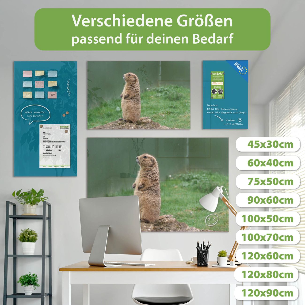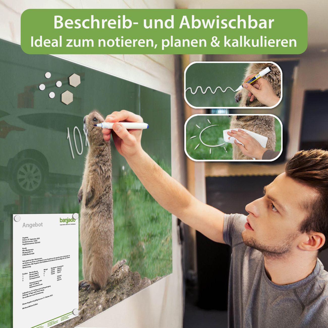Jede Glas Magnettafel wird in unserer Werkstatt von Hand gefertigt und sorgfältig geprüft. So erhalten Sie ein echtes Qualitätsprodukt, das Funktion und Ästhetik perfekt vereint.?? Warum banjado?