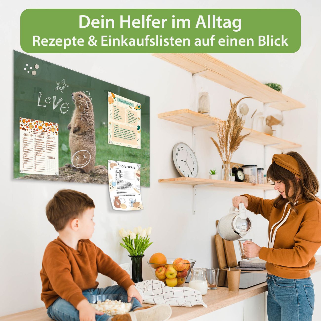 Auf der glatten Glasoberfläche lassen sich Termine, Rezepte oder Notizen ganz einfach mit Kreidestiften festhalten und rückstandslos entfernen. Starke Neodym-Magnete halten Ihre wichtigsten Erinnerungen sicher an Ort und Stelle. So entsteht Ihre ganz persönliche Ideenwand - jeden Tag neu.