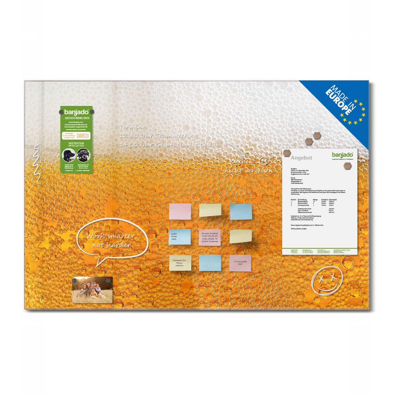 Jede Glas Magnettafel wird in unserer Werkstatt von Hand gefertigt und sorgfältig geprüft. So erhalten Sie ein echtes Qualitätsprodukt, das Funktion und Ästhetik perfekt vereint.?? Warum banjado?
