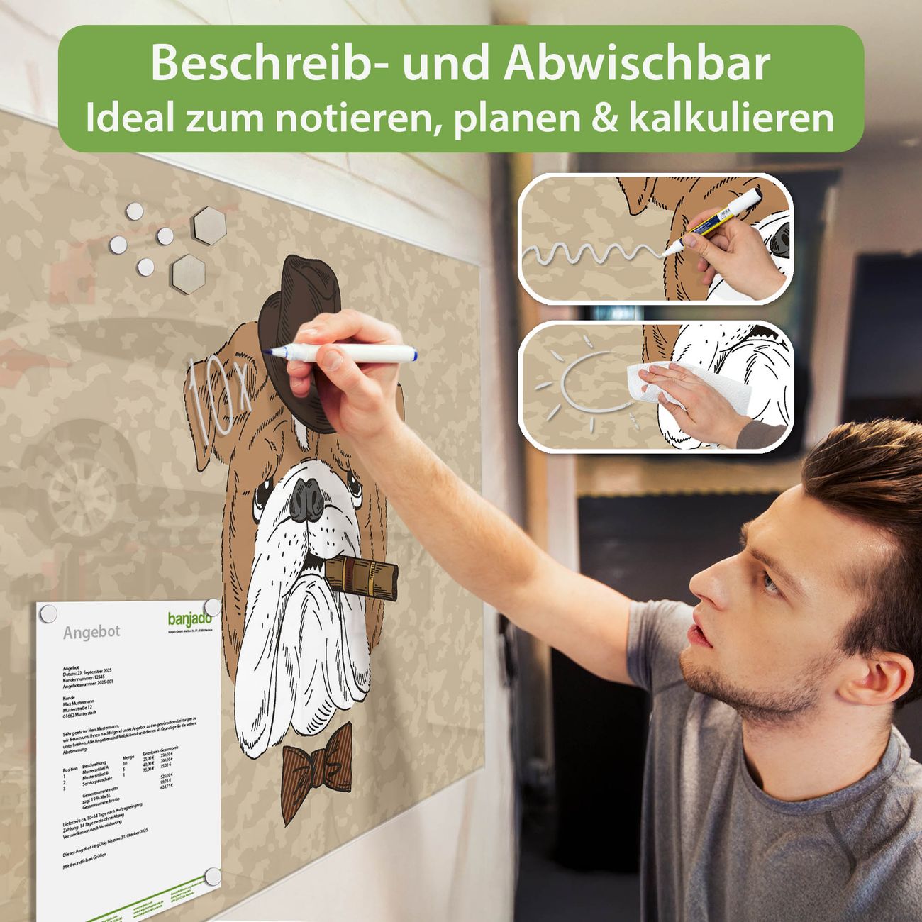 Jede Glas Magnettafel wird in unserer Werkstatt von Hand gefertigt und sorgfältig geprüft. So erhalten Sie ein echtes Qualitätsprodukt, das Funktion und Ästhetik perfekt vereint.?? Warum banjado?