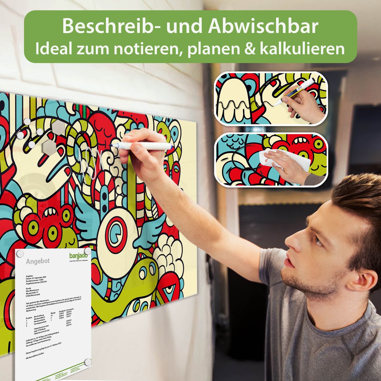 Jede Glas Magnettafel wird in unserer Werkstatt von Hand gefertigt und sorgfältig geprüft. So erhalten Sie ein echtes Qualitätsprodukt, das Funktion und Ästhetik perfekt vereint.?? Warum banjado?