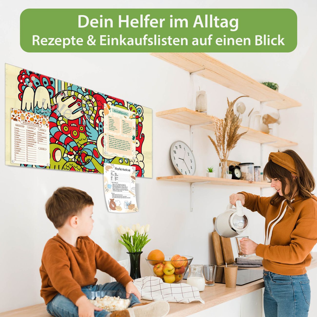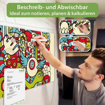 Auf der glatten Glasoberfläche lassen sich Termine, Rezepte oder Notizen ganz einfach mit Kreidestiften festhalten und rückstandslos entfernen. Starke Neodym-Magnete halten Ihre wichtigsten Erinnerungen sicher an Ort und Stelle. So entsteht Ihre ganz persönliche Ideenwand - jeden Tag neu.