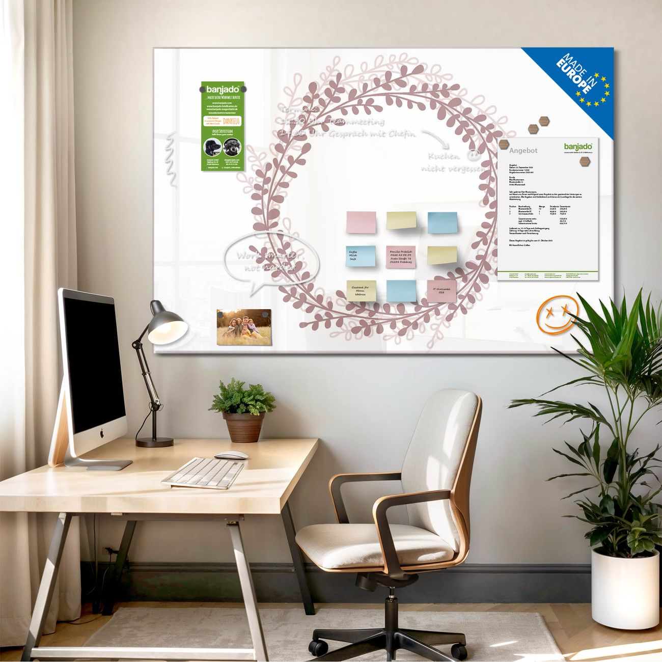 Die banjado Glas Magnettafel mit dem Motiv Motiv Blätterkranz verbindet Funktionalität mit Stil. Sie ersetzt das Zettelchaos durch klare Strukturen und bringt dabei eine warme, natürliche Atmosphäre in Ihr Zuhause. Ob im Büro, in der Küche oder im Eingangsbereich - dieses Design-Board zieht Blicke an und sorgt für Ordnung mit Charakter.
