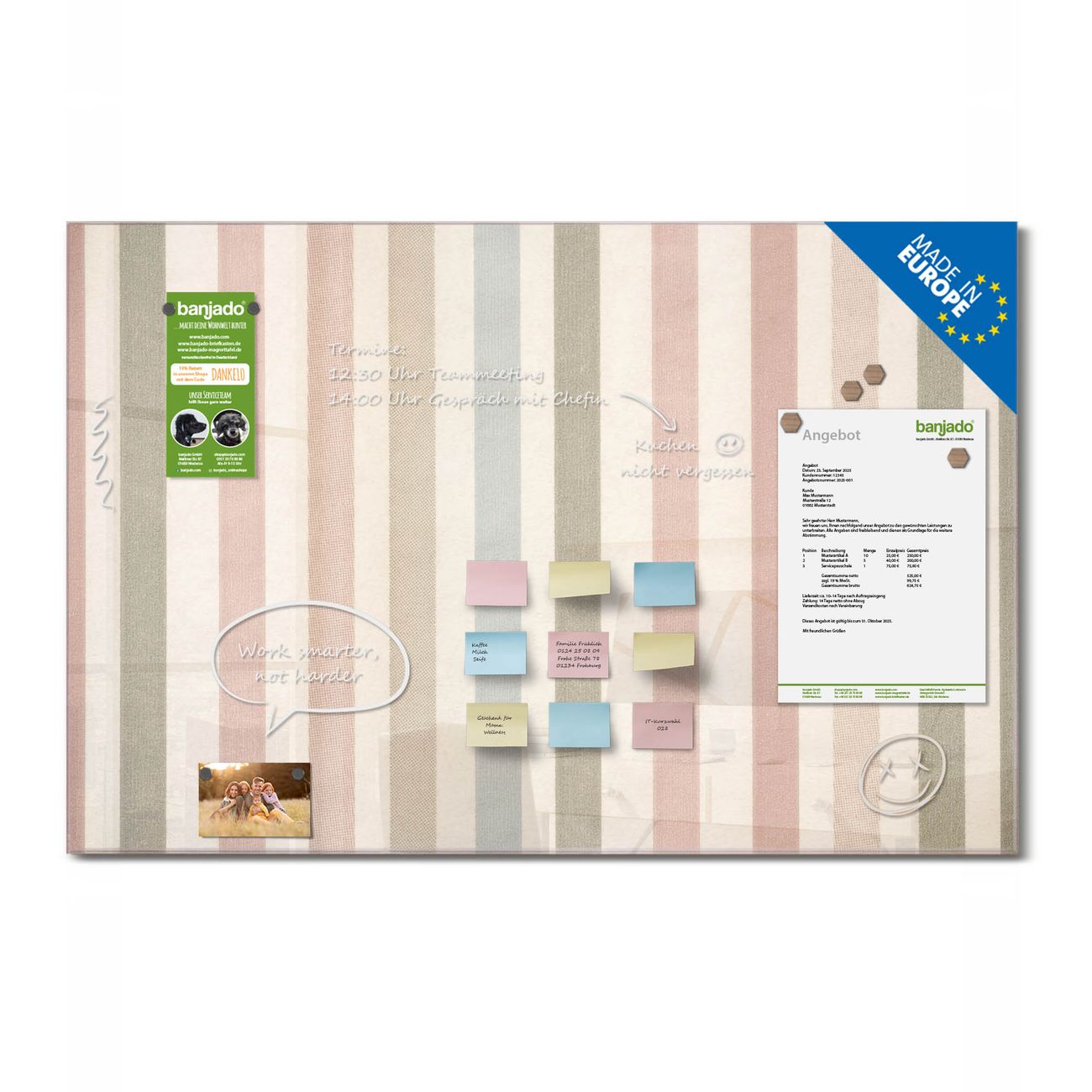 Jede Glas Magnettafel wird in unserer Werkstatt von Hand gefertigt und sorgfältig geprüft. So erhalten Sie ein echtes Qualitätsprodukt, das Funktion und Ästhetik perfekt vereint.?? Warum banjado?
