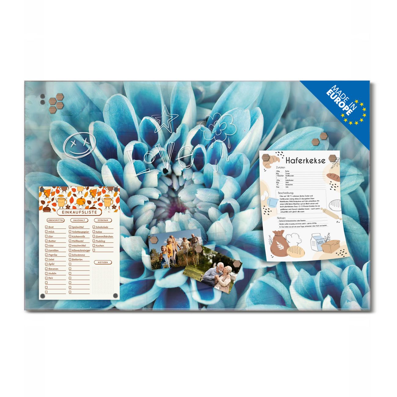 Ein Stück Design, das Ihren Alltag organisiert. Schreiben, heften, inspirieren - alles an einem Ort. Qualität, die man spürt. Montage leicht gemacht. Handwerk mit Herz - veredelt in Sachsen. Einzigartiges Design mit Motiv Motiv Blaue Blüten Beschreibbare Glasoberfläche, leicht zu reinigen Starke Magnetkraft durch Stahlrückwand Inklusive 4 Neodym-Magneten Flexible Montageoptionen Handveredelt in Sachsen - Qualität, die bleibt