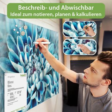 Die banjado Glas Magnettafel mit dem Motiv Motiv Blaue Blüten verbindet Funktionalität mit Stil. Sie ersetzt das Zettelchaos durch klare Strukturen und bringt dabei eine warme, natürliche Atmosphäre in Ihr Zuhause. Ob im Büro, in der Küche oder im Eingangsbereich - dieses Design-Board zieht Blicke an und sorgt für Ordnung mit Charakter.