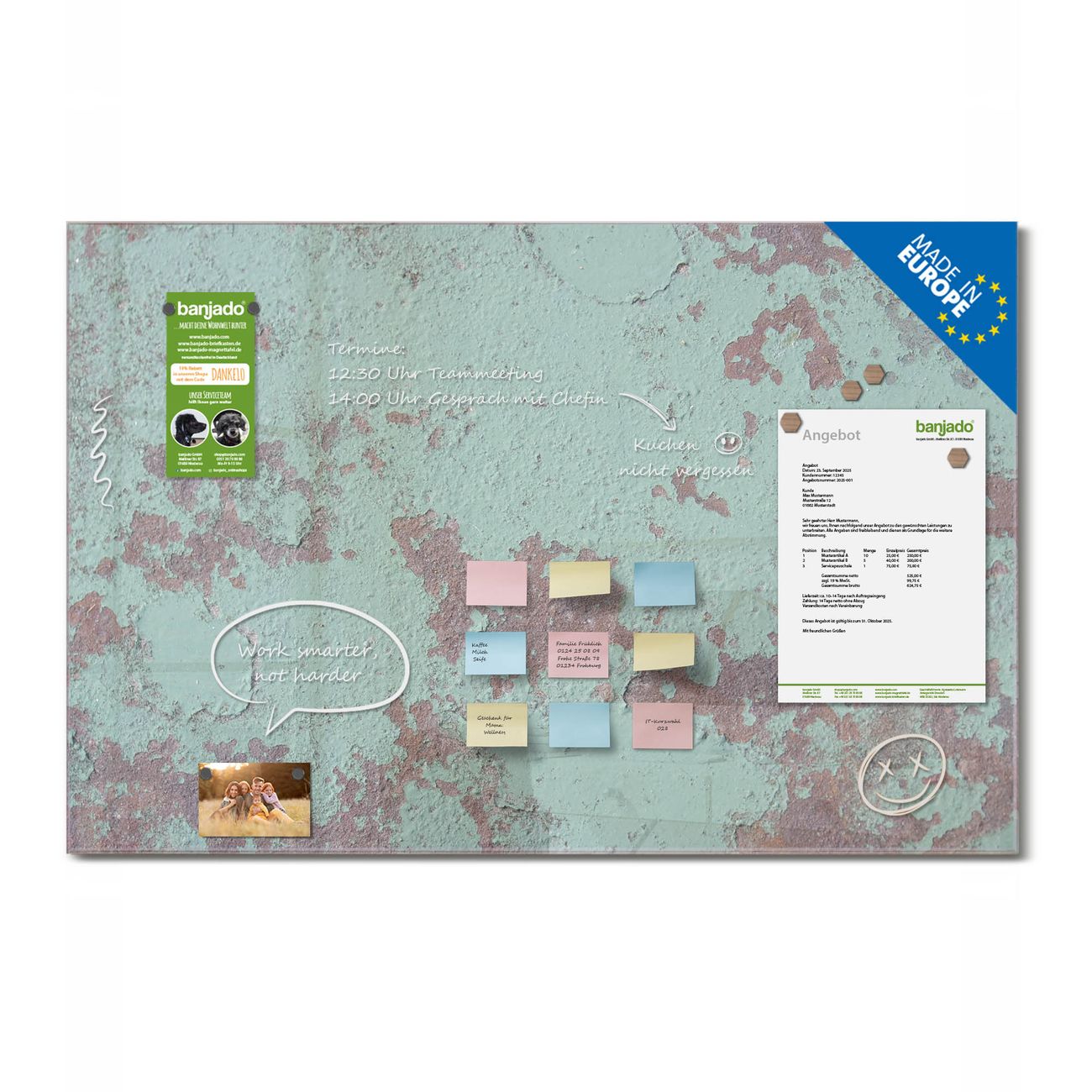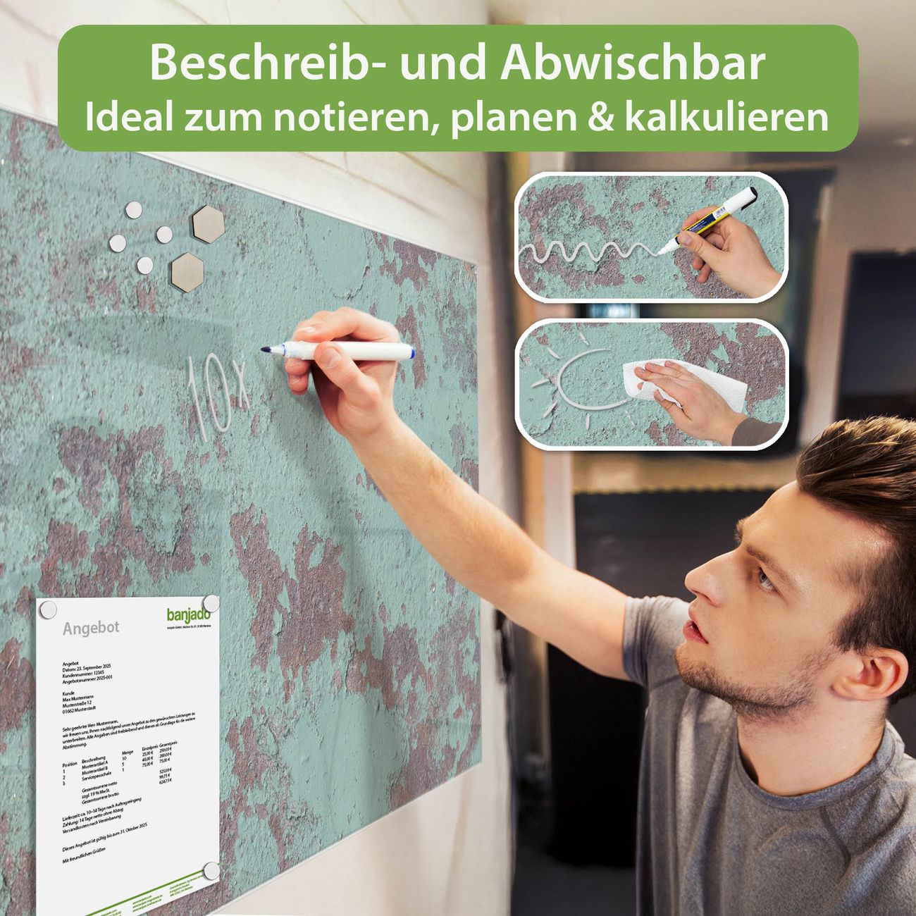 Jede Glas Magnettafel wird in unserer Werkstatt von Hand gefertigt und sorgfältig geprüft. So erhalten Sie ein echtes Qualitätsprodukt, das Funktion und Ästhetik perfekt vereint.?? Warum banjado?