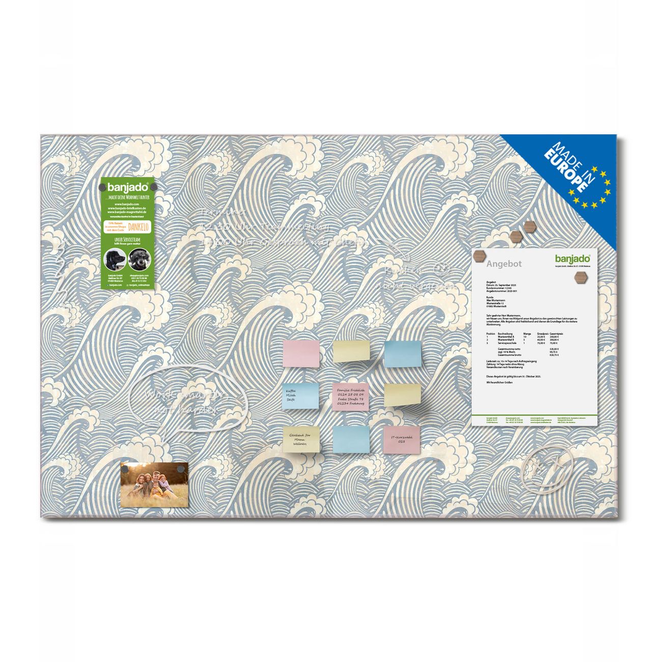 Ein Stück Design, das Ihren Alltag organisiert. Schreiben, heften, inspirieren - alles an einem Ort. Qualität, die man spürt. Montage leicht gemacht. Handwerk mit Herz - veredelt in Sachsen. Einzigartiges Design mit Motiv Motiv Blaue Wellen Beschreibbare Glasoberfläche, leicht zu reinigen Starke Magnetkraft durch Stahlrückwand Inklusive 4 Neodym-Magneten Flexible Montageoptionen Handveredelt in Sachsen - Qualität, die bleibt