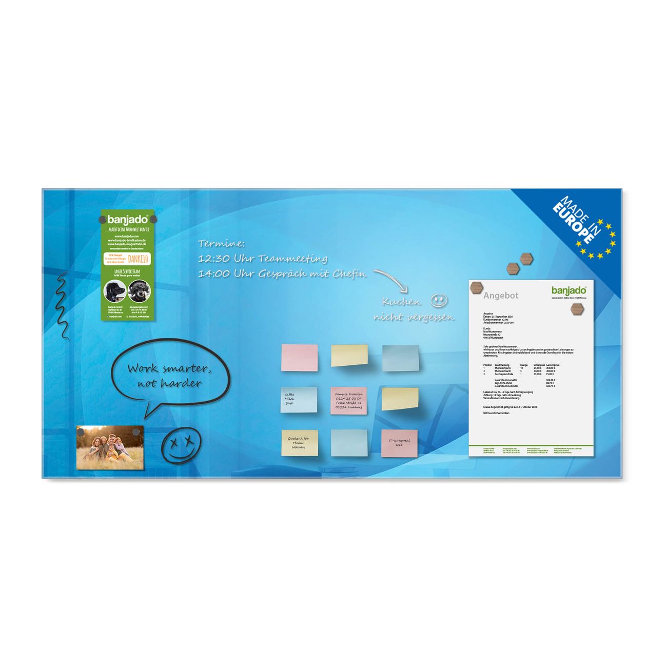 Jede Glas Magnettafel wird in unserer Werkstatt von Hand gefertigt und sorgfältig geprüft. So erhalten Sie ein echtes Qualitätsprodukt, das Funktion und Ästhetik perfekt vereint.?? Warum banjado?