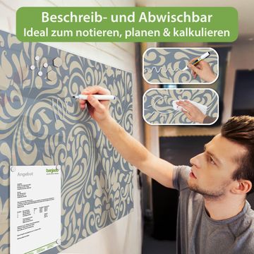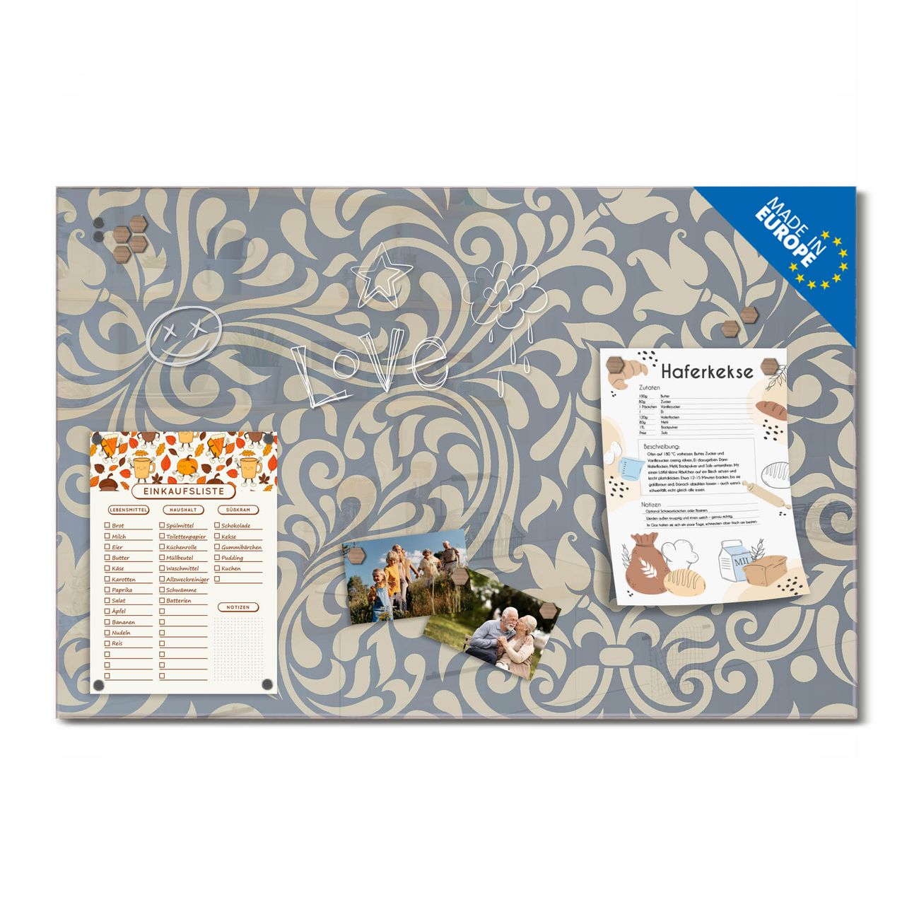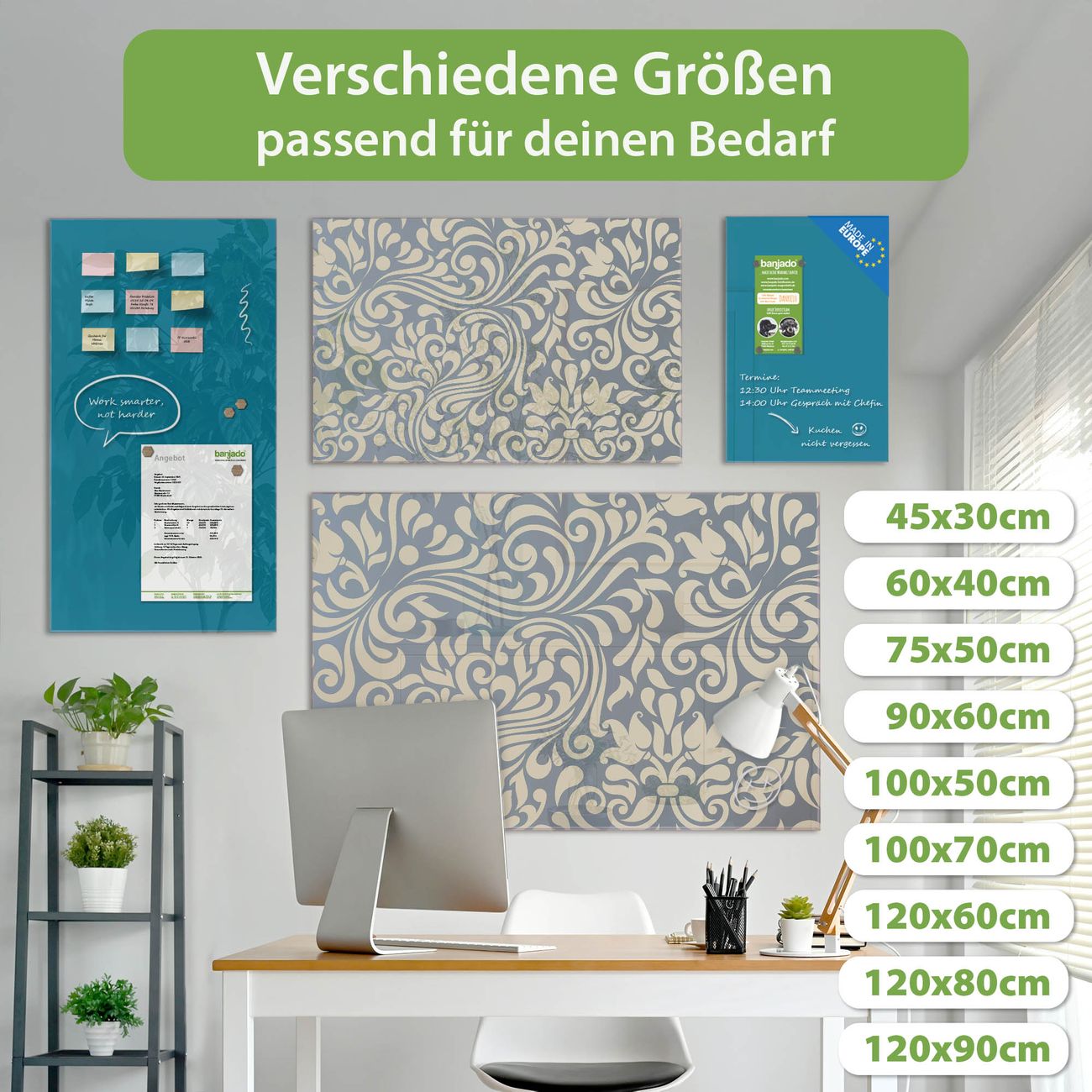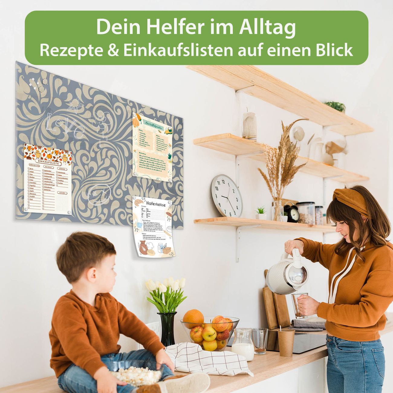 Ein Stück Design, das Ihren Alltag organisiert. Schreiben, heften, inspirieren - alles an einem Ort. Qualität, die man spürt. Montage leicht gemacht. Handwerk mit Herz - veredelt in Sachsen. Einzigartiges Design mit Motiv Motiv Blaues Ornament Beschreibbare Glasoberfläche, leicht zu reinigen Starke Magnetkraft durch Stahlrückwand Inklusive 4 Neodym-Magneten Flexible Montageoptionen Handveredelt in Sachsen - Qualität, die bleibt