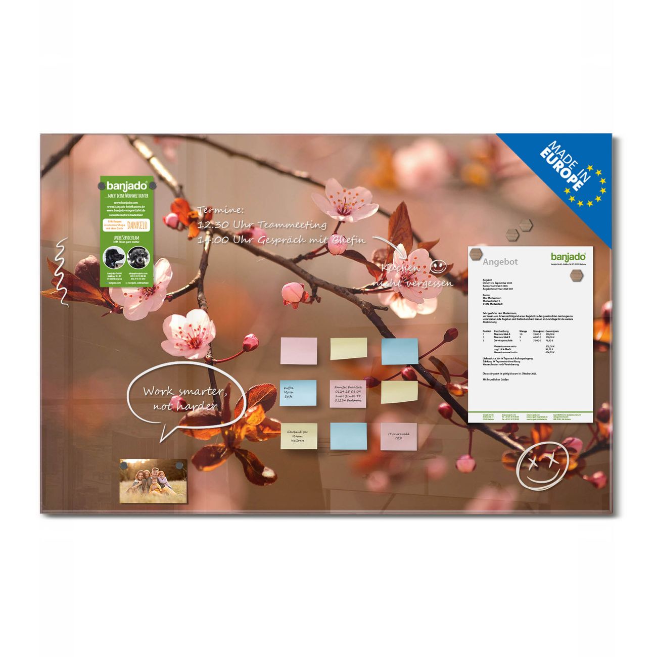 Jede Glas Magnettafel wird in unserer Werkstatt von Hand gefertigt und sorgfältig geprüft. So erhalten Sie ein echtes Qualitätsprodukt, das Funktion und Ästhetik perfekt vereint.?? Warum banjado?