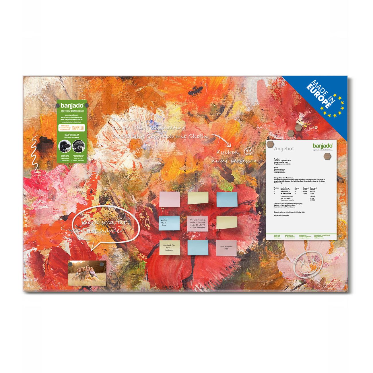 Jede Glas Magnettafel wird in unserer Werkstatt von Hand gefertigt und sorgfältig geprüft. So erhalten Sie ein echtes Qualitätsprodukt, das Funktion und Ästhetik perfekt vereint.?? Warum banjado?