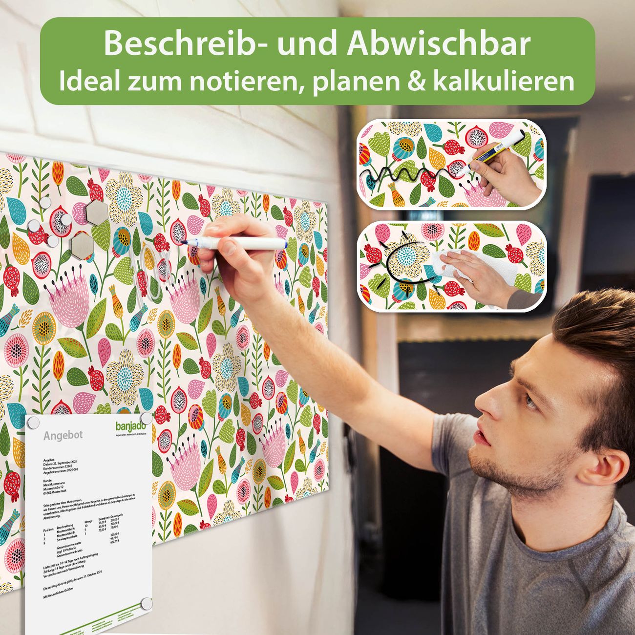 Jede Glas Magnettafel wird in unserer Werkstatt von Hand gefertigt und sorgfältig geprüft. So erhalten Sie ein echtes Qualitätsprodukt, das Funktion und Ästhetik perfekt vereint.?? Warum banjado?