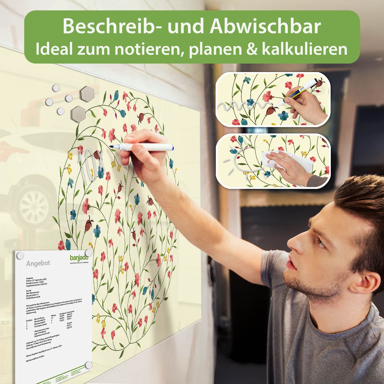 Jede Glas Magnettafel wird in unserer Werkstatt von Hand gefertigt und sorgfältig geprüft. So erhalten Sie ein echtes Qualitätsprodukt, das Funktion und Ästhetik perfekt vereint.?? Warum banjado?