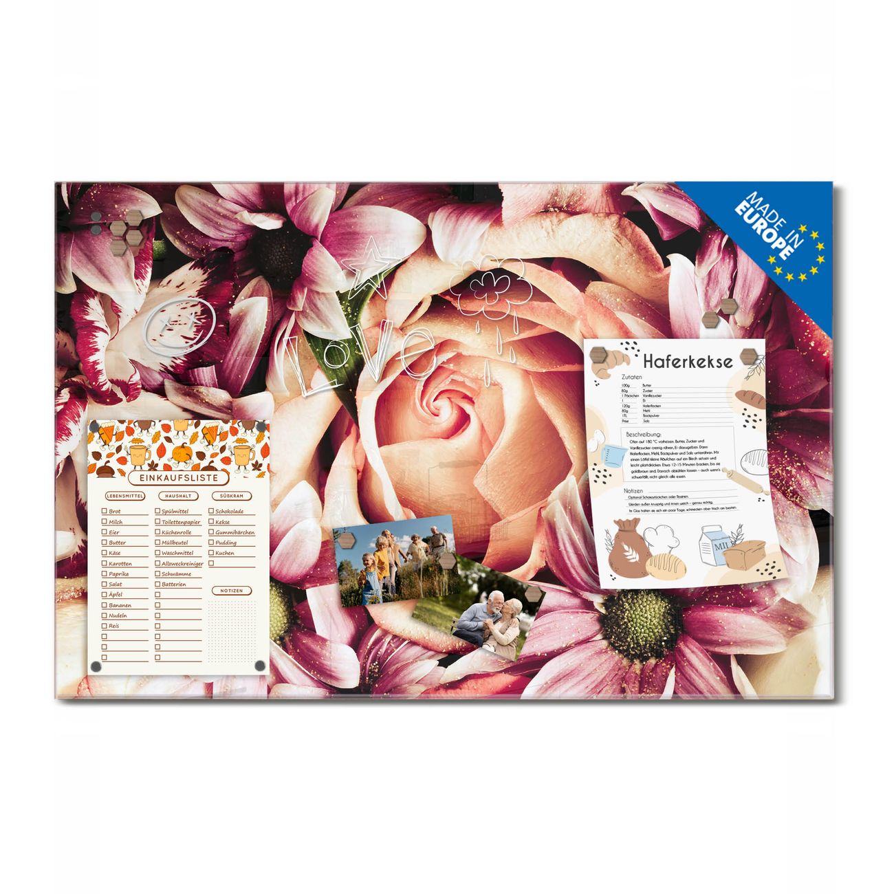 Ein Stück Design, das Ihren Alltag organisiert. Schreiben, heften, inspirieren - alles an einem Ort. Qualität, die man spürt. Montage leicht gemacht. Handwerk mit Herz - veredelt in Sachsen. Einzigartiges Design mit Motiv Motiv Brautstrauss Beschreibbare Glasoberfläche, leicht zu reinigen Starke Magnetkraft durch Stahlrückwand Inklusive 4 Neodym-Magneten Flexible Montageoptionen Handveredelt in Sachsen - Qualität, die bleibt