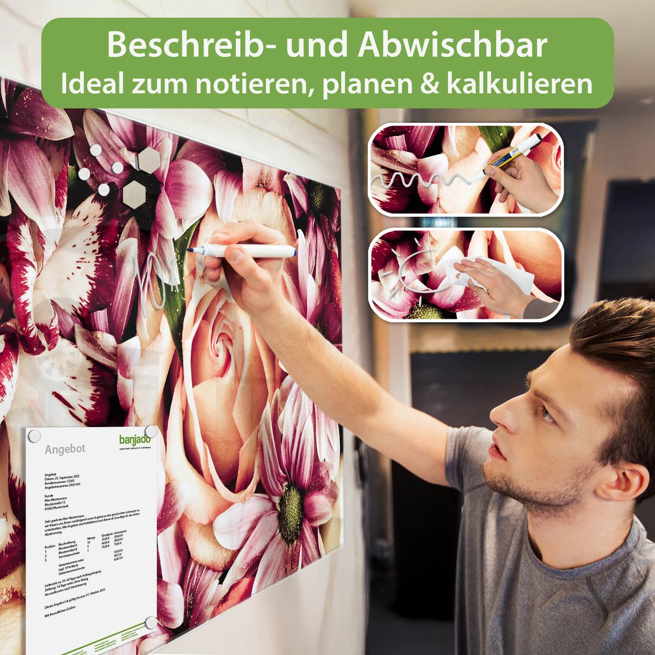 Jede Glas Magnettafel wird in unserer Werkstatt von Hand gefertigt und sorgfältig geprüft. So erhalten Sie ein echtes Qualitätsprodukt, das Funktion und Ästhetik perfekt vereint.?? Warum banjado?