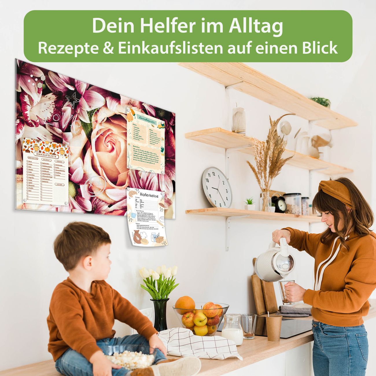 Auf der glatten Glasoberfläche lassen sich Termine, Rezepte oder Notizen ganz einfach mit Kreidestiften festhalten und rückstandslos entfernen. Starke Neodym-Magnete halten Ihre wichtigsten Erinnerungen sicher an Ort und Stelle. So entsteht Ihre ganz persönliche Ideenwand - jeden Tag neu.