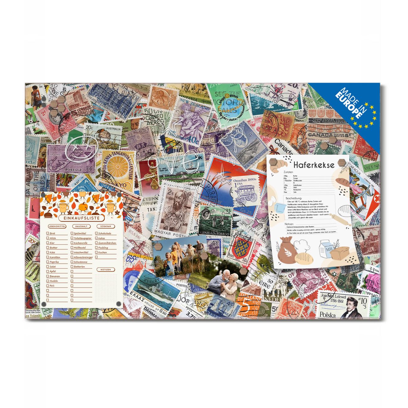 Ein Stück Design, das Ihren Alltag organisiert. Schreiben, heften, inspirieren - alles an einem Ort. Qualität, die man spürt. Montage leicht gemacht. Handwerk mit Herz - veredelt in Sachsen. Einzigartiges Design mit Motiv Motiv Briefmarken Beschreibbare Glasoberfläche, leicht zu reinigen Starke Magnetkraft durch Stahlrückwand Inklusive 4 Neodym-Magneten Flexible Montageoptionen Handveredelt in Sachsen - Qualität, die bleibt