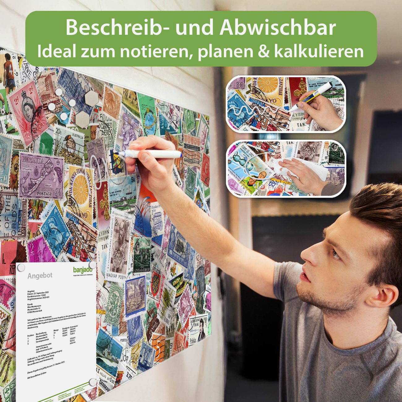 Jede Glas Magnettafel wird in unserer Werkstatt von Hand gefertigt und sorgfältig geprüft. So erhalten Sie ein echtes Qualitätsprodukt, das Funktion und Ästhetik perfekt vereint.?? Warum banjado?