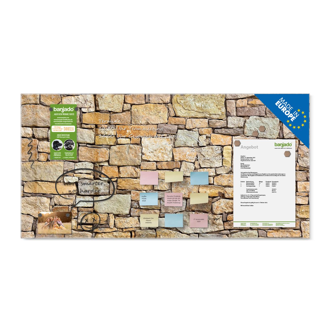 Ein Stück Design, das Ihren Alltag organisiert. Schreiben, heften, inspirieren - alles an einem Ort. Qualität, die man spürt. Montage leicht gemacht. Handwerk mit Herz - veredelt in Sachsen. Einzigartiges Design mit Motiv Motiv Bruchsteinmauer Beschreibbare Glasoberfläche, leicht zu reinigen Starke Magnetkraft durch Stahlrückwand Inklusive 4 Neodym-Magneten Flexible Montageoptionen Handveredelt in Sachsen - Qualität, die bleibt