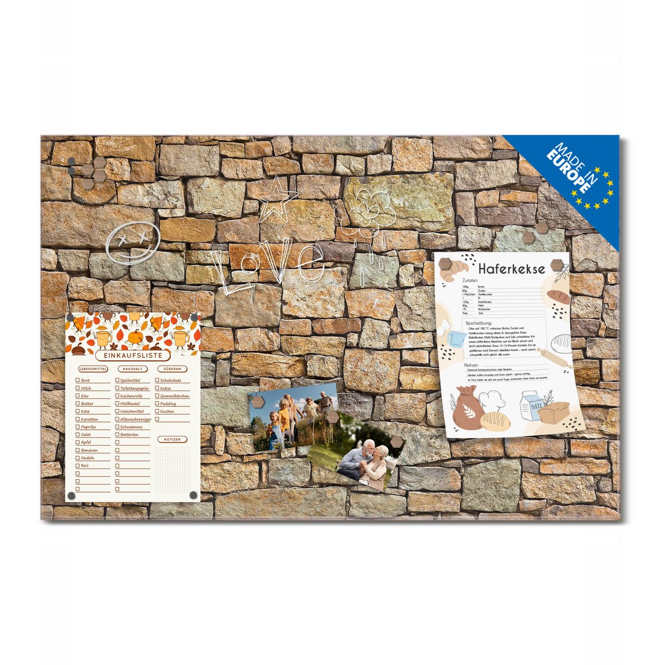 Ein Stück Design, das Ihren Alltag organisiert. Schreiben, heften, inspirieren - alles an einem Ort. Qualität, die man spürt. Montage leicht gemacht. Handwerk mit Herz - veredelt in Sachsen. Einzigartiges Design mit Motiv Motiv Bruchsteinmauer Beschreibbare Glasoberfläche, leicht zu reinigen Starke Magnetkraft durch Stahlrückwand Inklusive 4 Neodym-Magneten Flexible Montageoptionen Handveredelt in Sachsen - Qualität, die bleibt