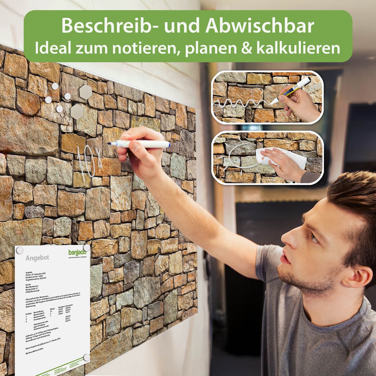Jede Glas Magnettafel wird in unserer Werkstatt von Hand gefertigt und sorgfältig geprüft. So erhalten Sie ein echtes Qualitätsprodukt, das Funktion und Ästhetik perfekt vereint.?? Warum banjado?