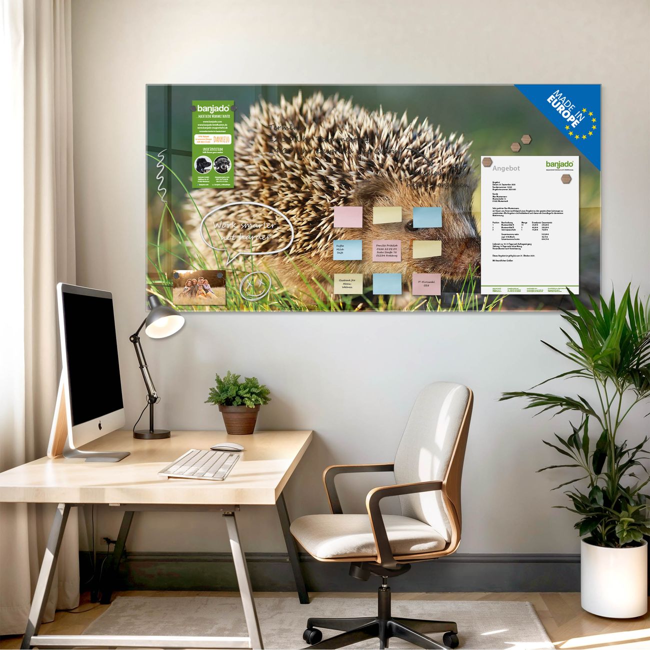 Die banjado Glas Magnettafel mit dem Motiv Motiv Bruno verbindet Funktionalität mit Stil. Sie ersetzt das Zettelchaos durch klare Strukturen und bringt dabei eine warme, natürliche Atmosphäre in Ihr Zuhause. Ob im Büro, in der Küche oder im Eingangsbereich - dieses Design-Board zieht Blicke an und sorgt für Ordnung mit Charakter.